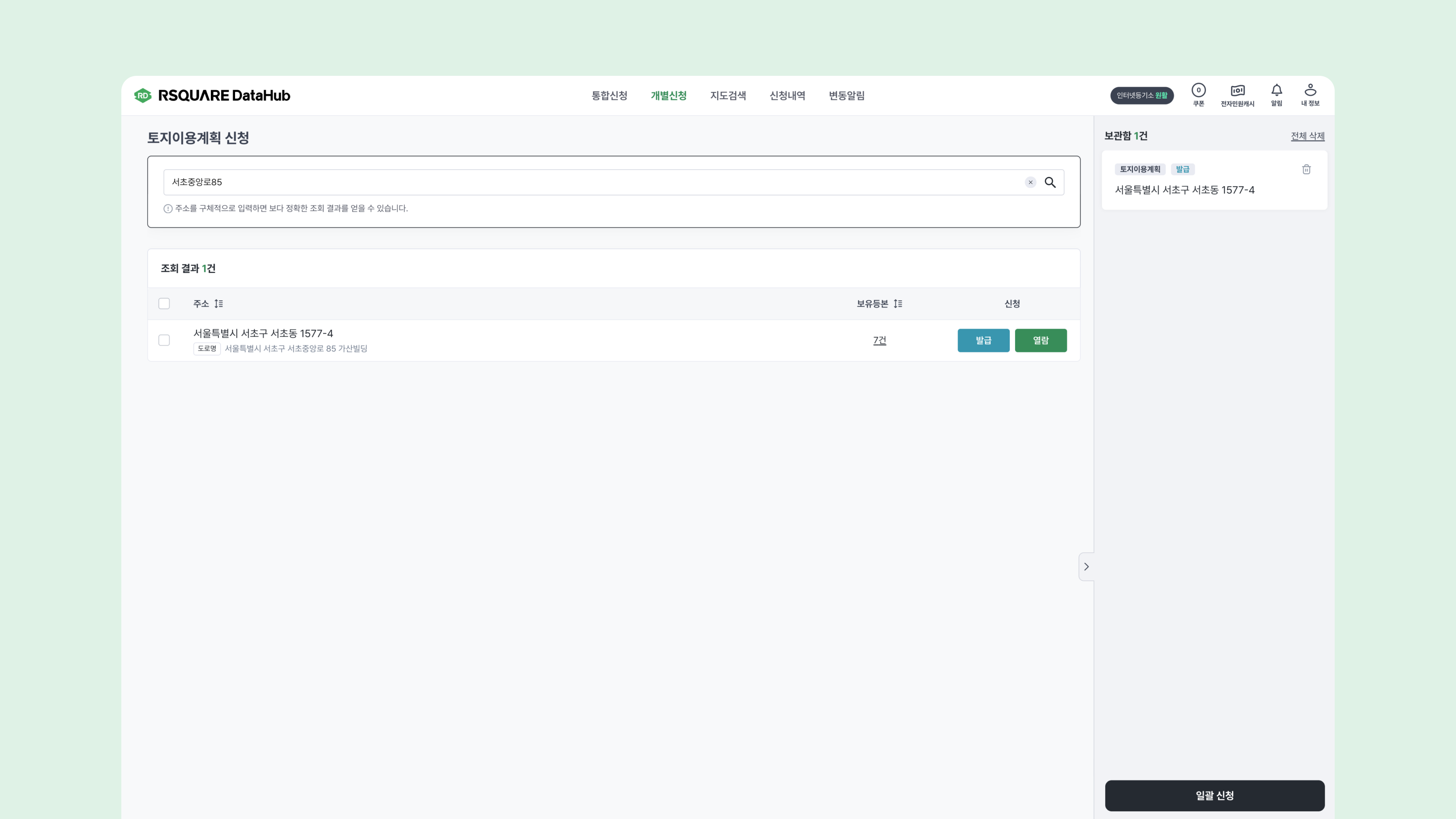 보관함에 담은 토지이용계획 정보를 확인한 후 일괄 신청 버튼을 클릭하여 열람/발급을 신청합니다.
