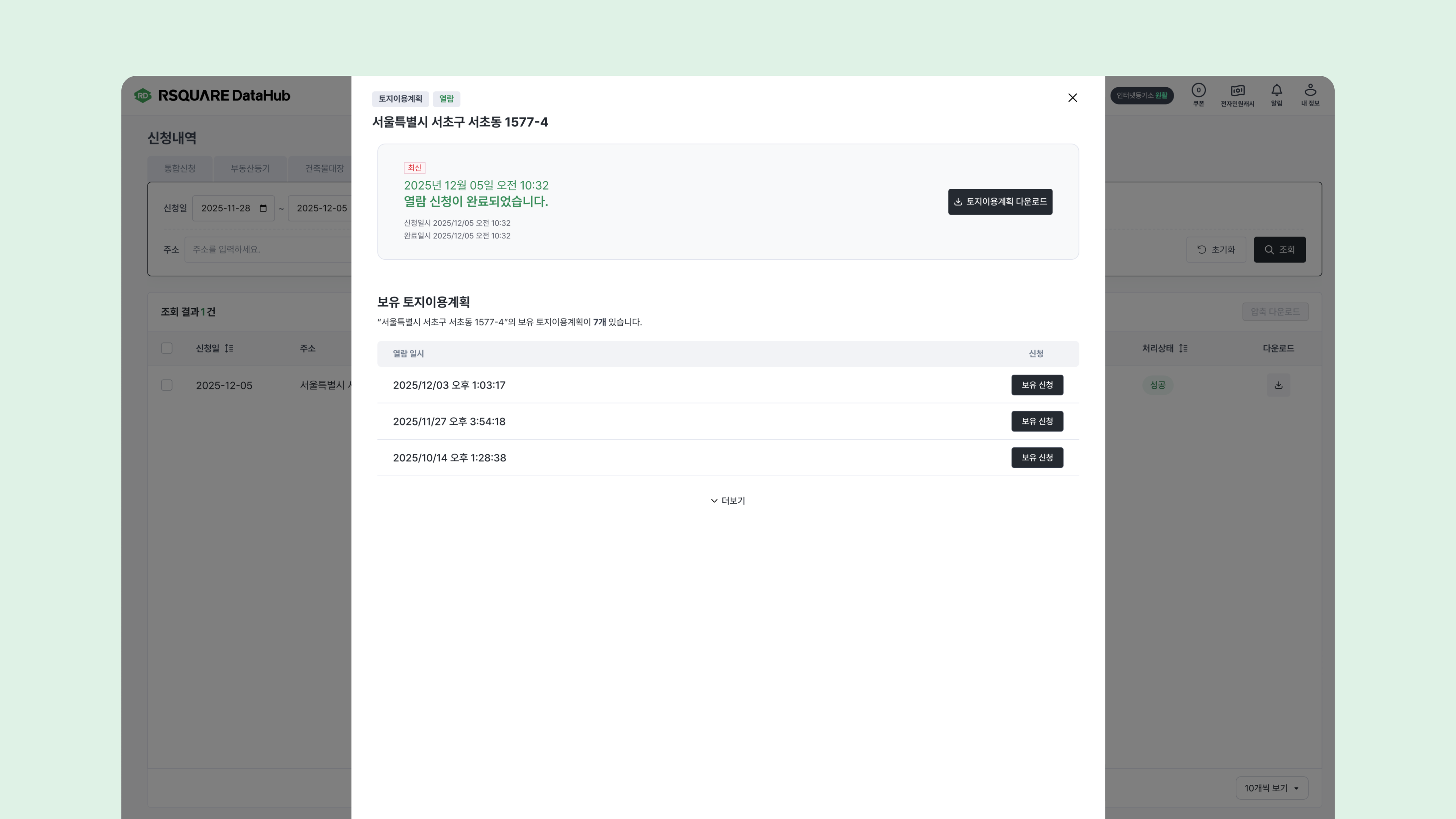 신청한 토지이용계획과 동일한 주소의 다른 일자 토지이용계획을 데이터허브가 보유하고 있는 경우, 보유신청 버튼을 클릭하여 해당 토지이용계획을 추가로 열람할 수 있습니다.