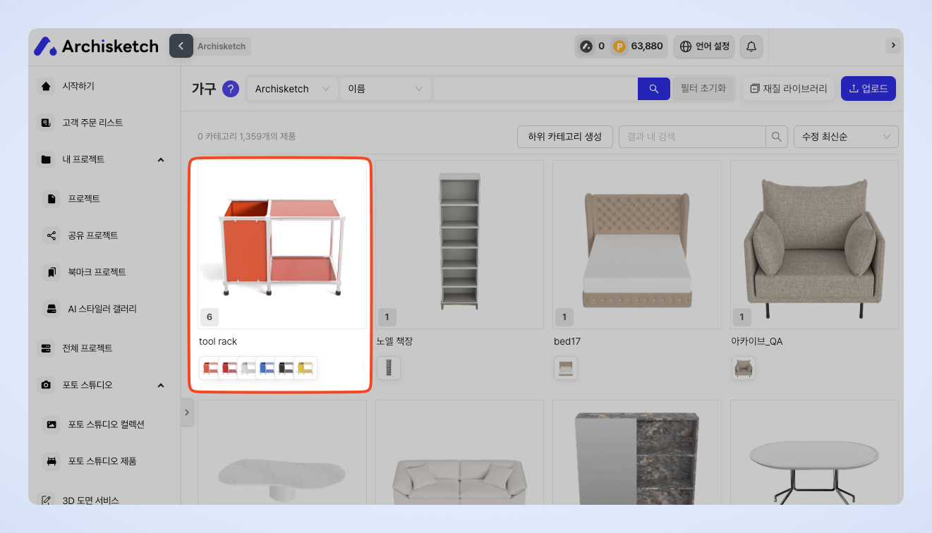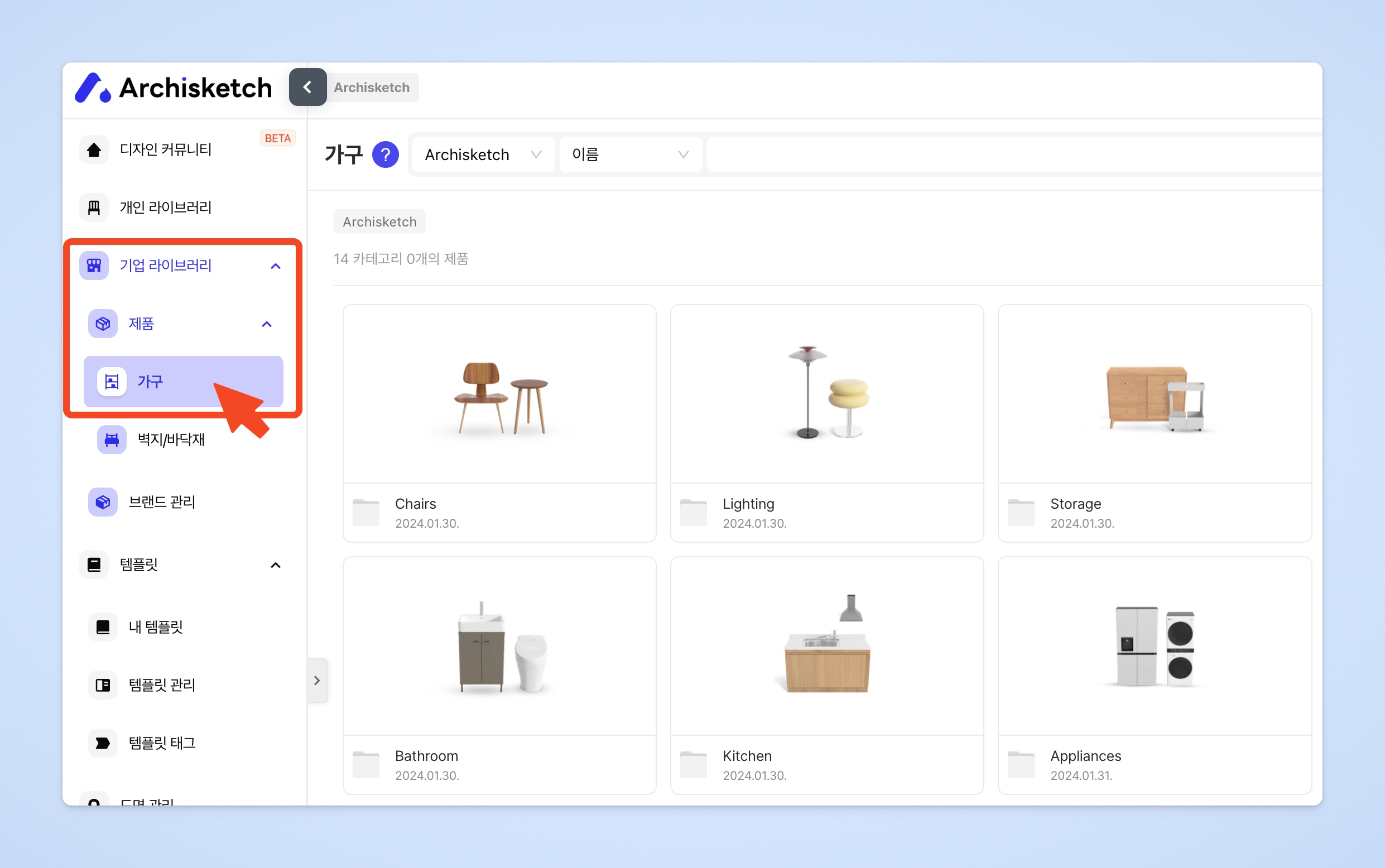 대시보드 → 기업 라이브러리 → 제품 → 가구 → 원하는 카테고리