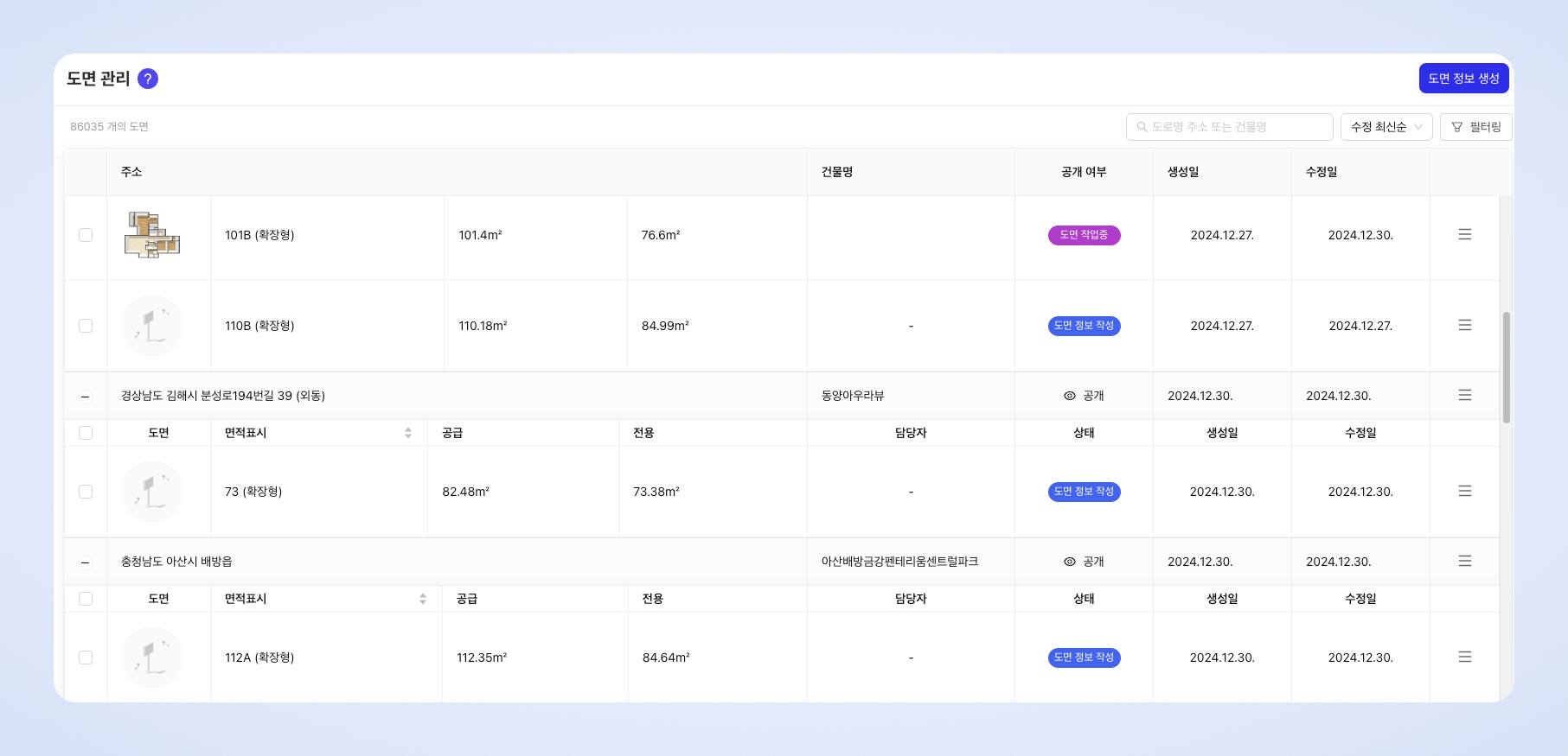[도면 관리] 탭을 통해 기업에서 직접 도면을 업로드할 수 있습니다.