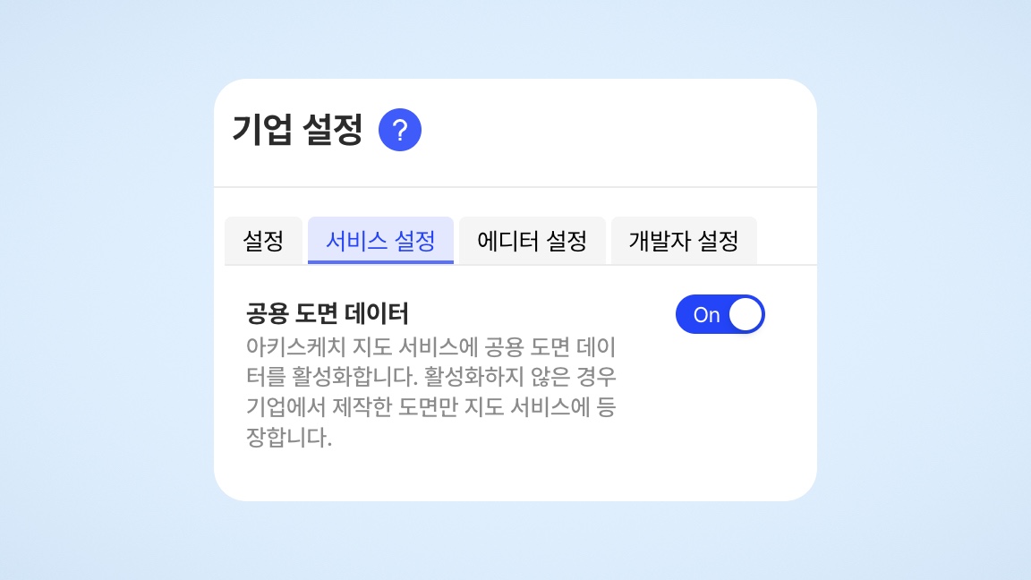 공용 도면 데이터를 활성화하지 않으려면, 설정에서 'Off'로 변경해 주세요. 이 경우, 지도 서비스에는 기업에서 제작한 도면만 표시됩니다.