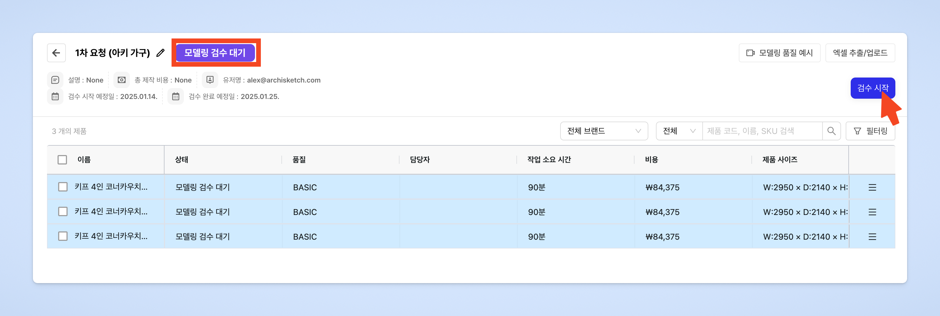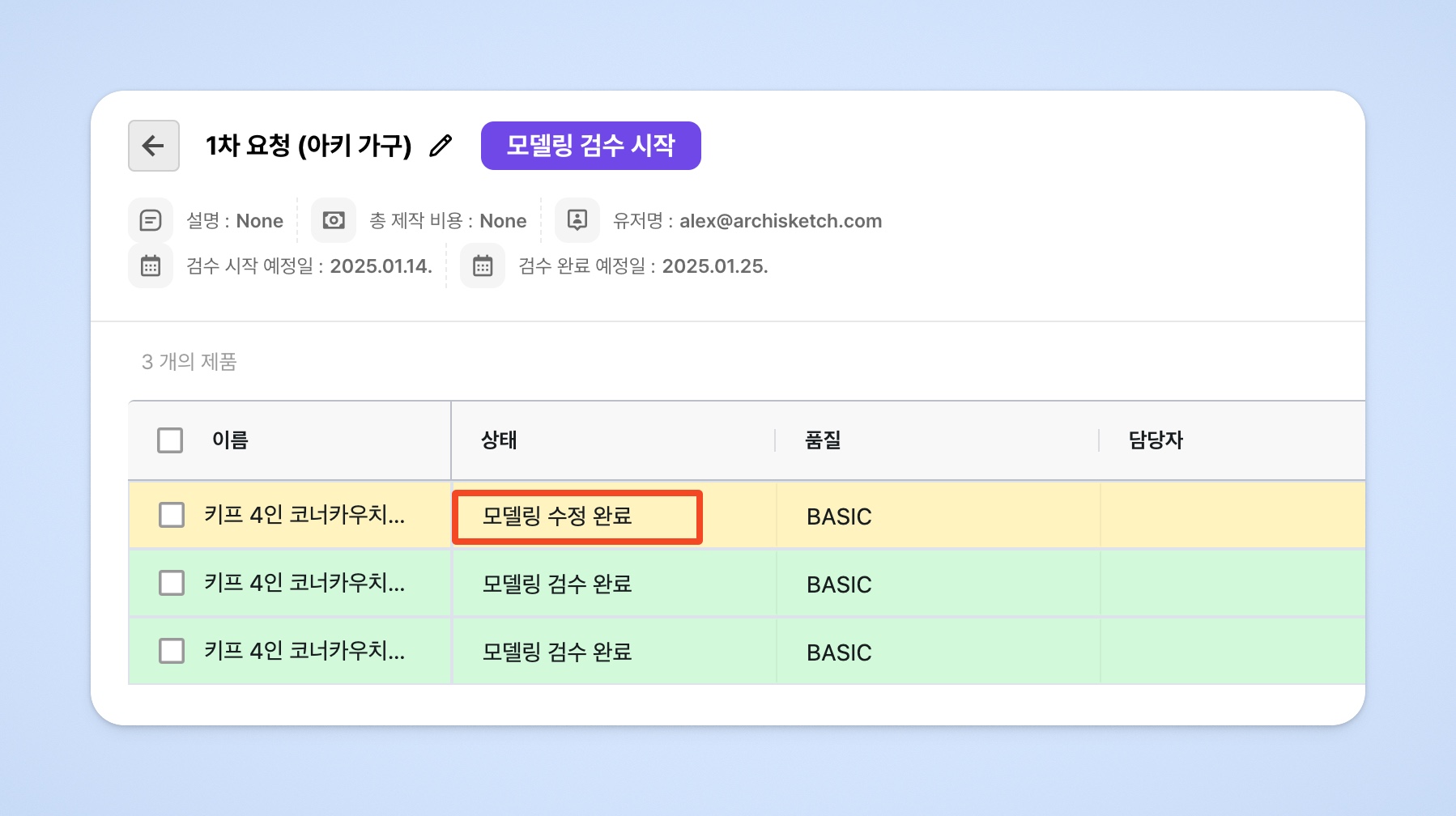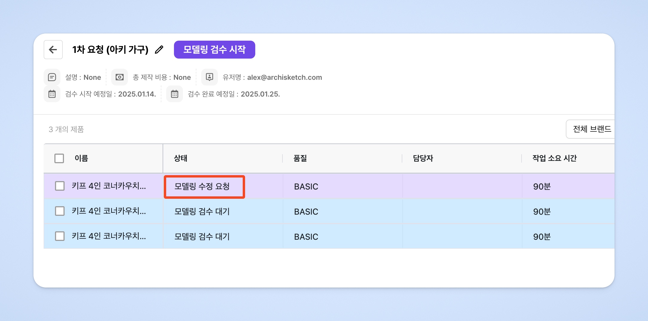 모델링 제작이 완료되면 요청서가 [모델링 검수 대기] 상태로 변경됩니다.