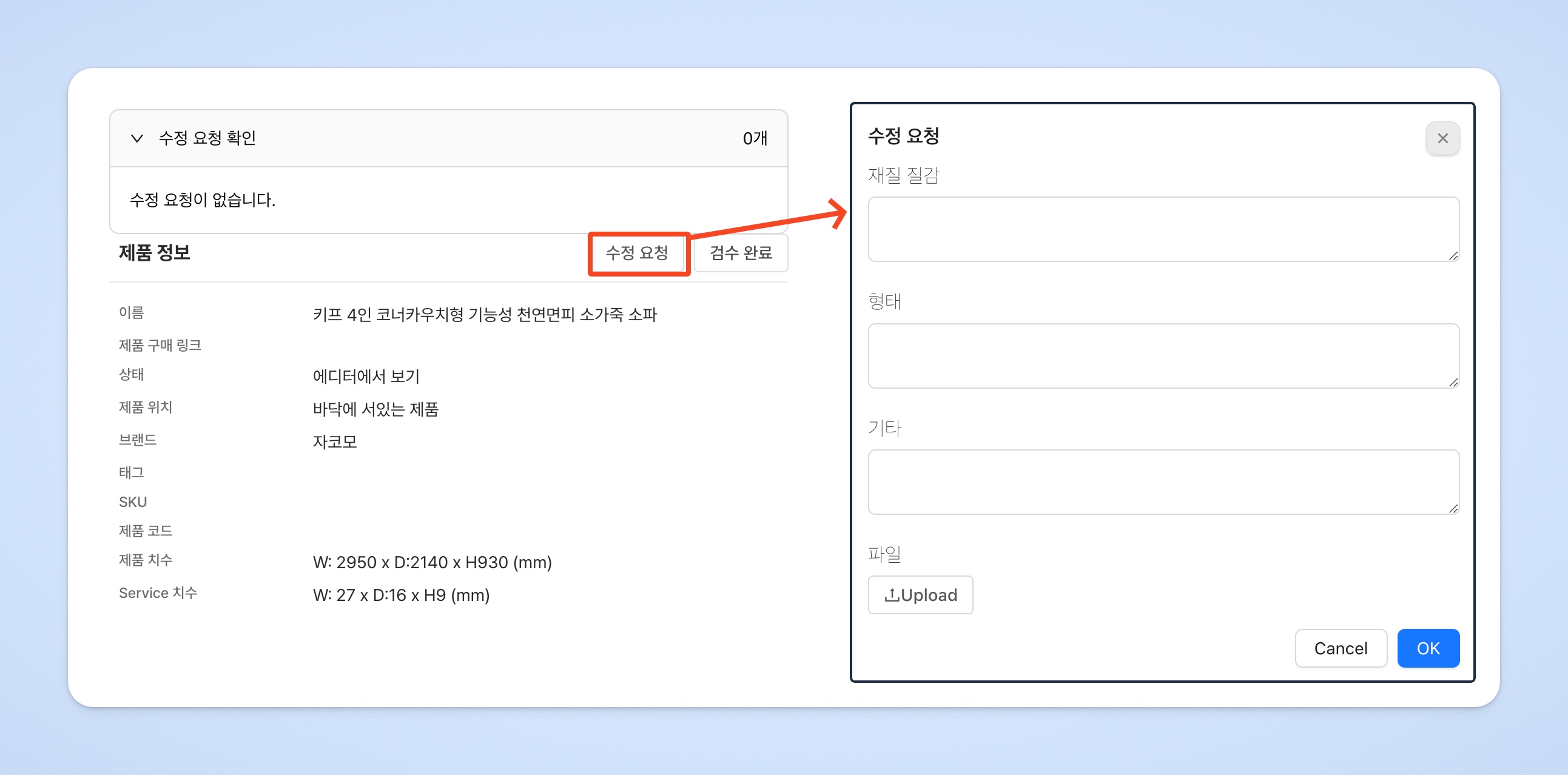재질 질감 / 형태 / 기타 각 항목에 수정 요청 내용을 작성 후 [OK]를 눌러 저장합니다.