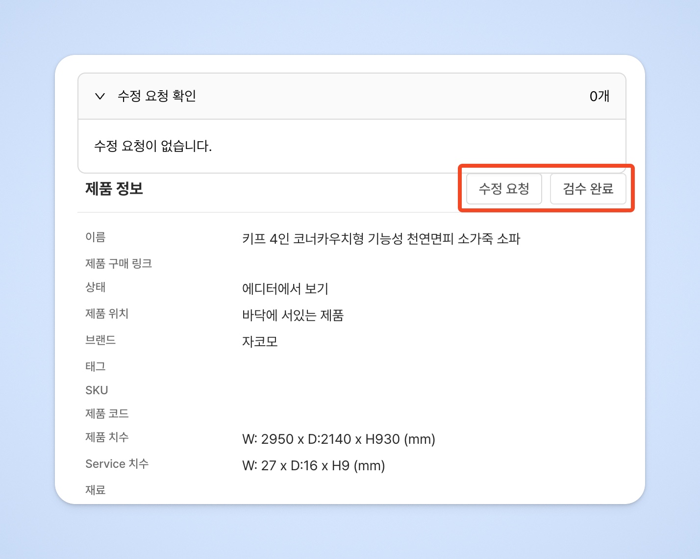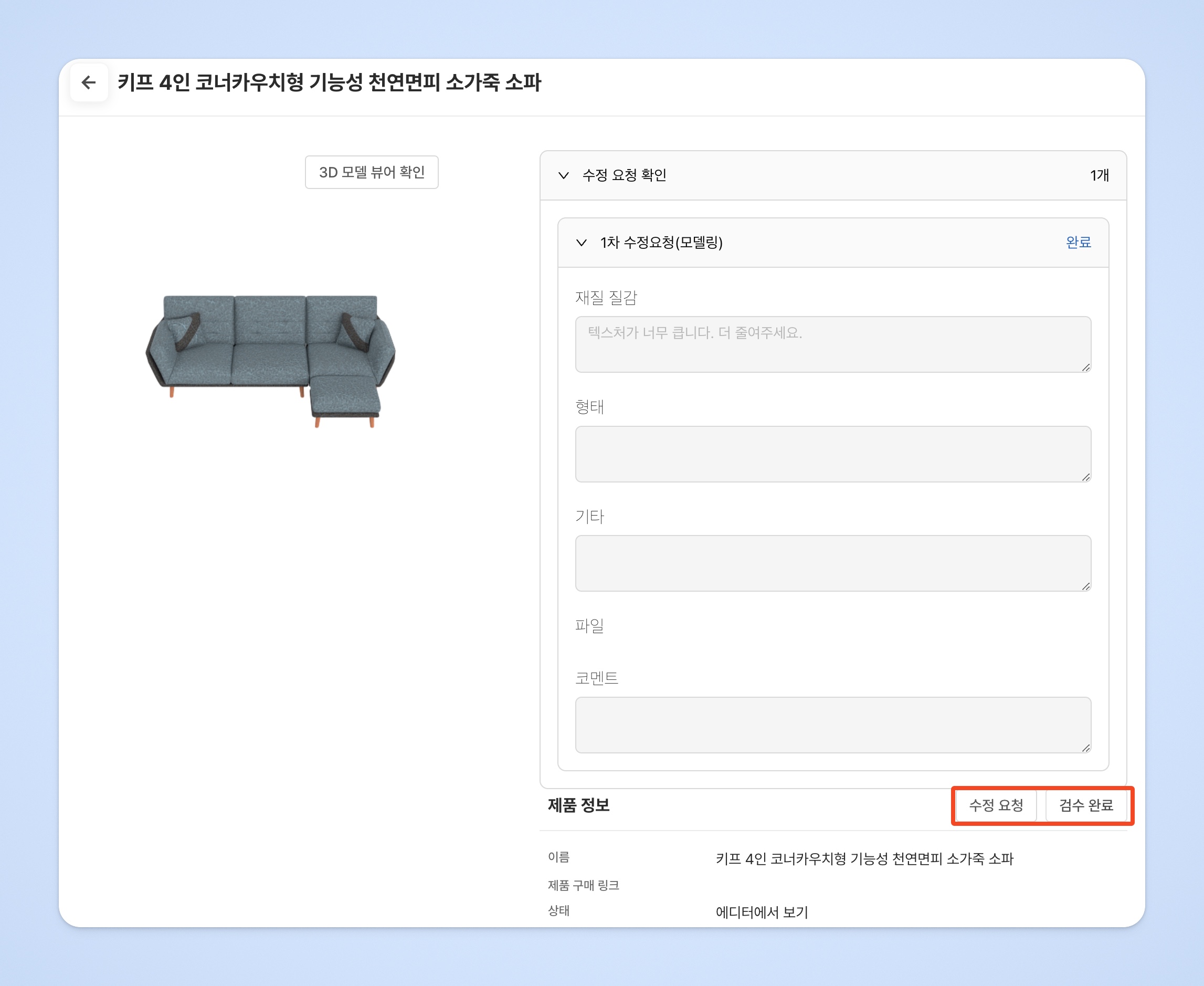 수정 요청이 필요 없는 제품은 [검수 완료] 버튼을 눌러주세요.