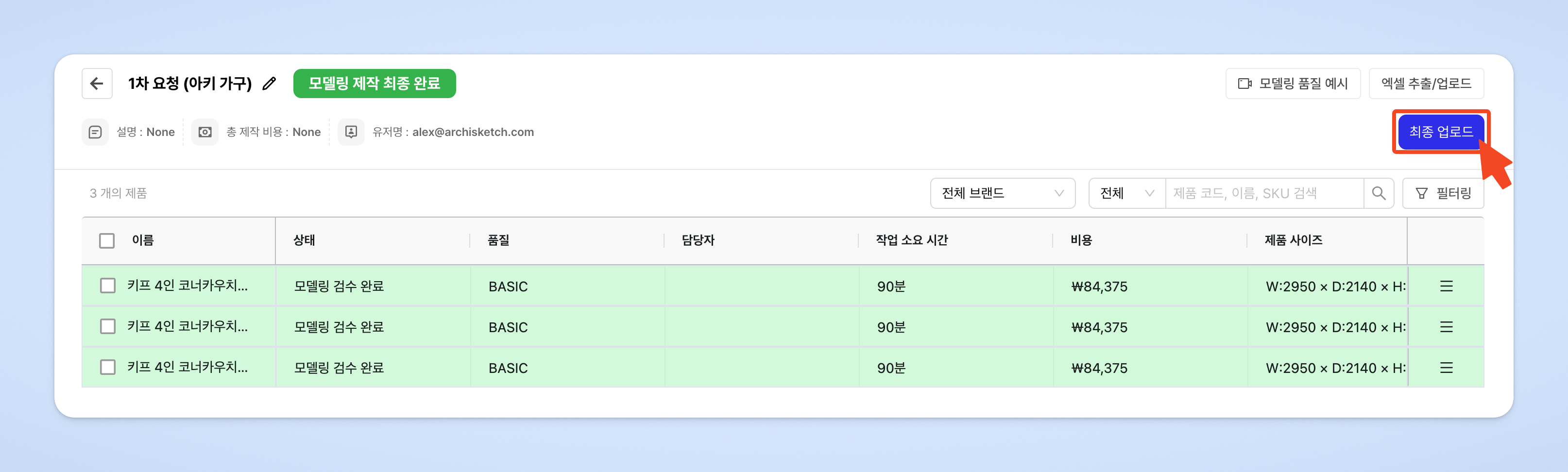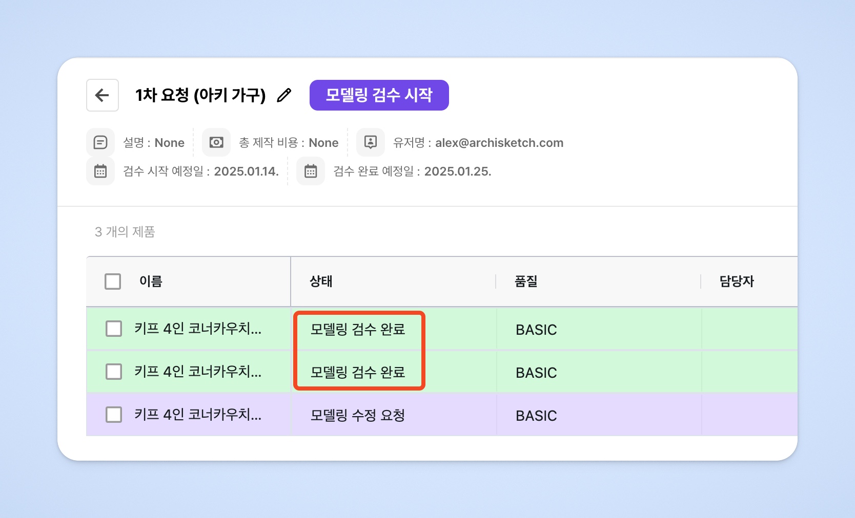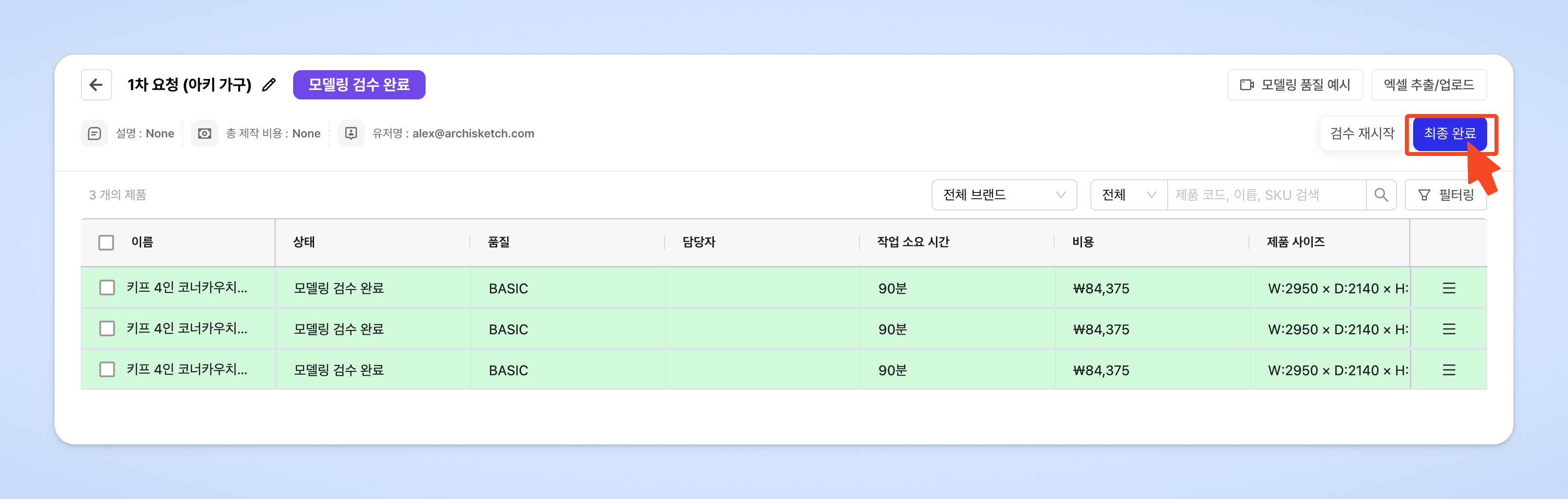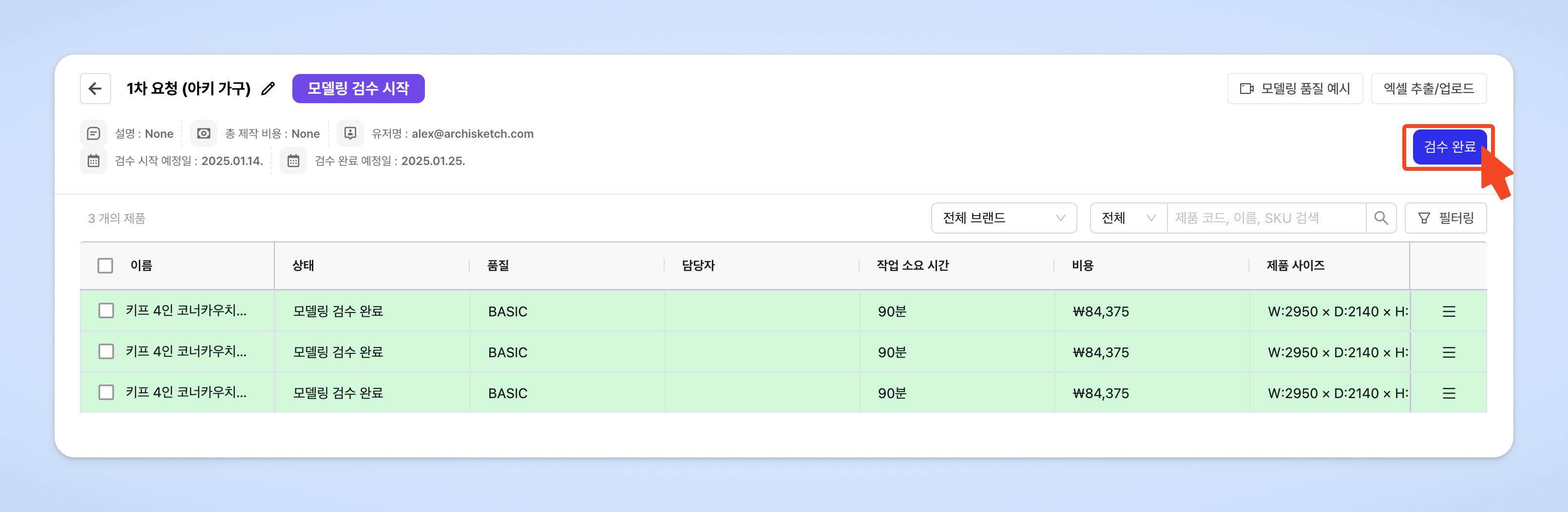 제품 상태가 [모델링 검수 완료]로 변경됩니다.