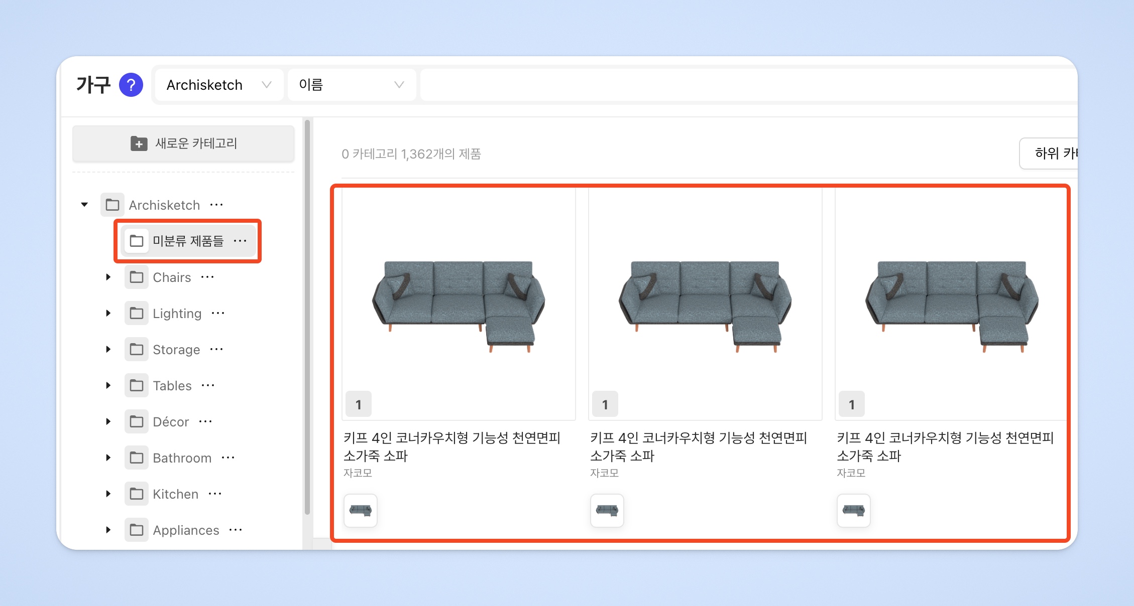 업로드된 가구들을 그룹화하여 하나로 묶어보세요. 가구 관리와 수정이 훨씬 편리해집니다!