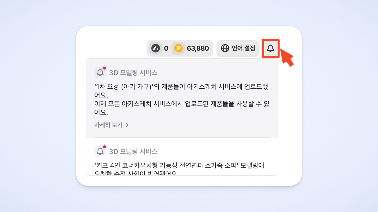 대시보드 상단 [알림] 아이콘을 통해서 제품 업로드 상황을 알 수 있습니다.