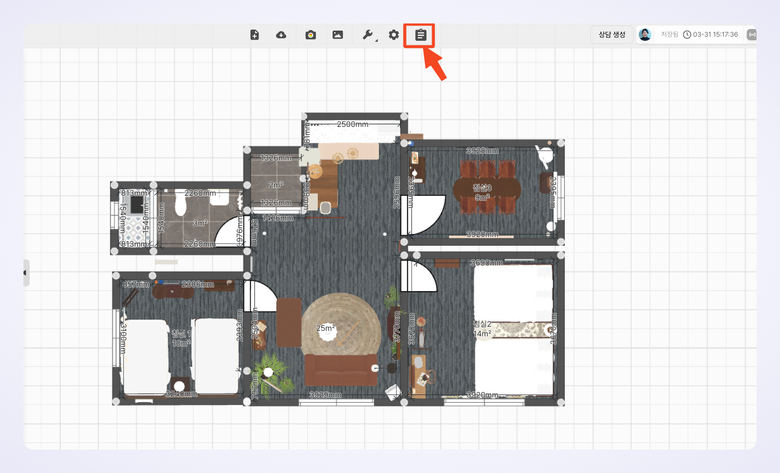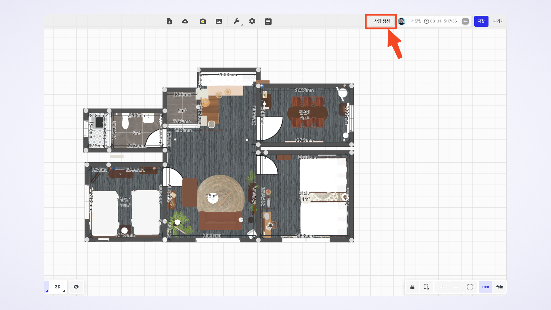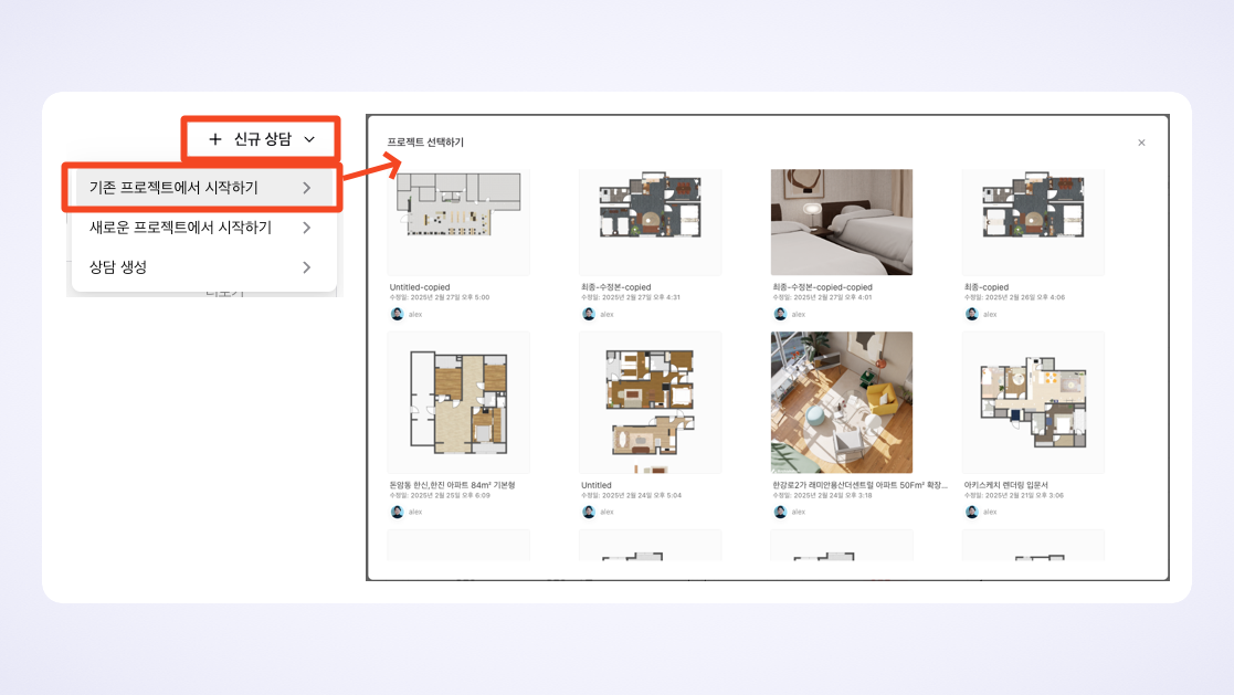 1번 기존 프로젝트에서 시작하기와 경로는 비슷합니다. 에디터에서 제품 배치 후 '상담 생성' 버튼 클릭을 통해서 상담을 생성해 주시면 됩니다.