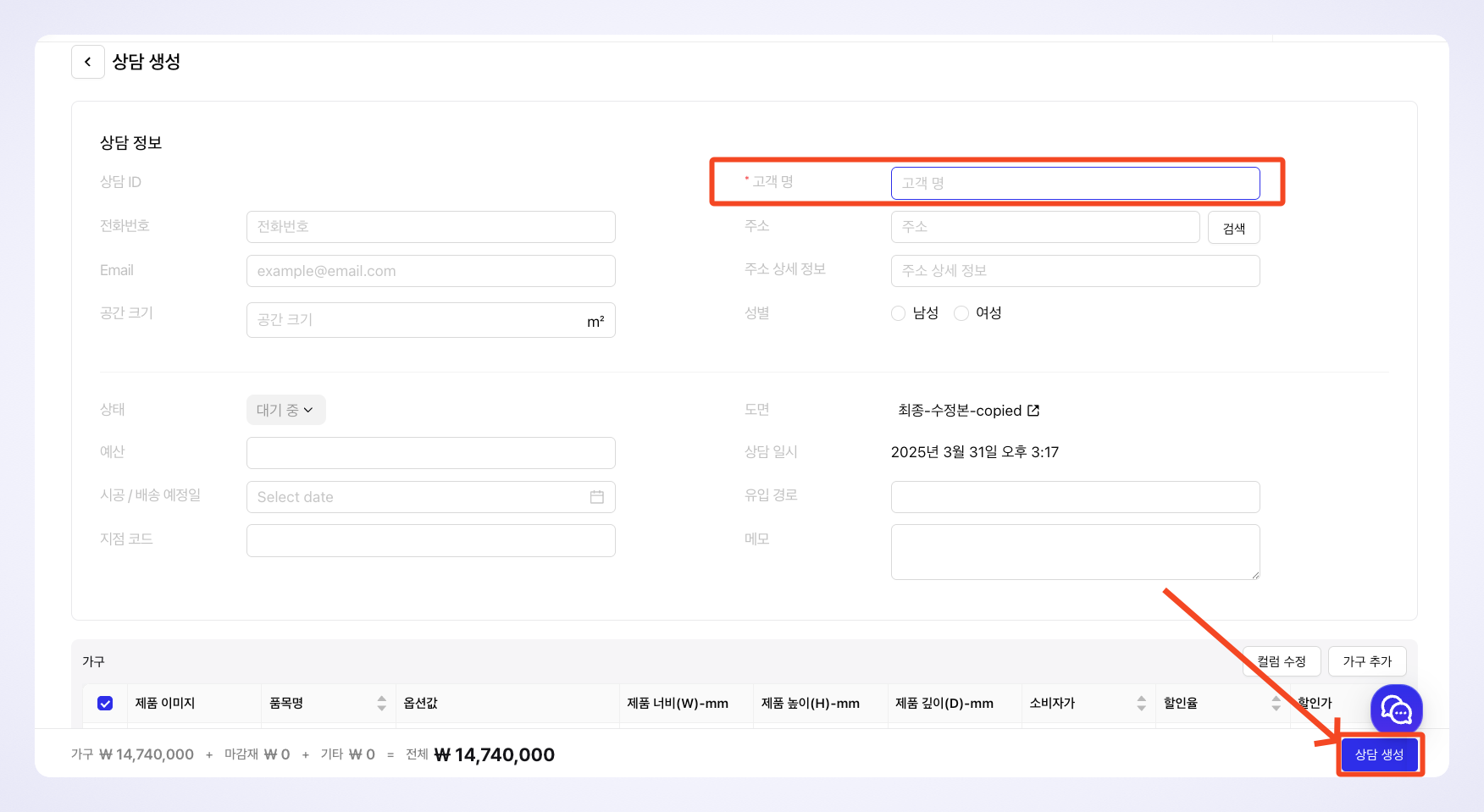 모든 내용 작성이 완료되면 [상담 생성] 버튼을 클릭합니다.