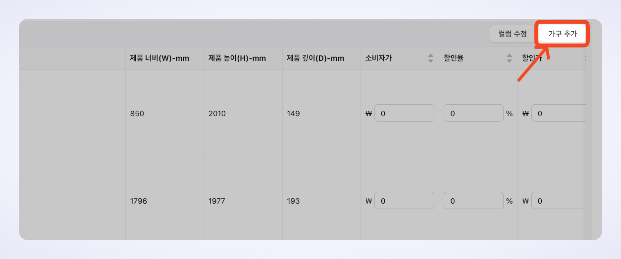배치하지 않은 제품이지만 리스트에 추가하고 싶다면 [가구 추가] 버튼을 눌러서 제품을 추가할 수 있습니다.