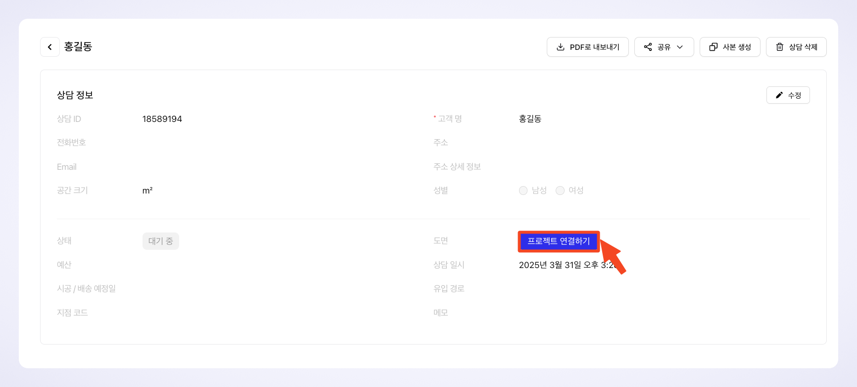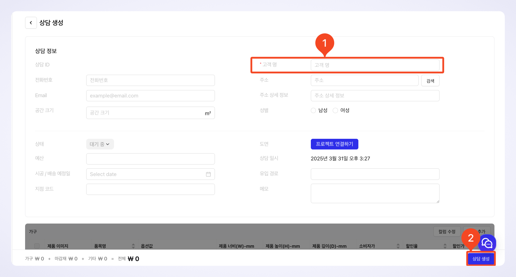 3️⃣ 상담 생성 : 프로젝트 연동 없이 고객 정보를 먼저 입력할 수 있습니다.