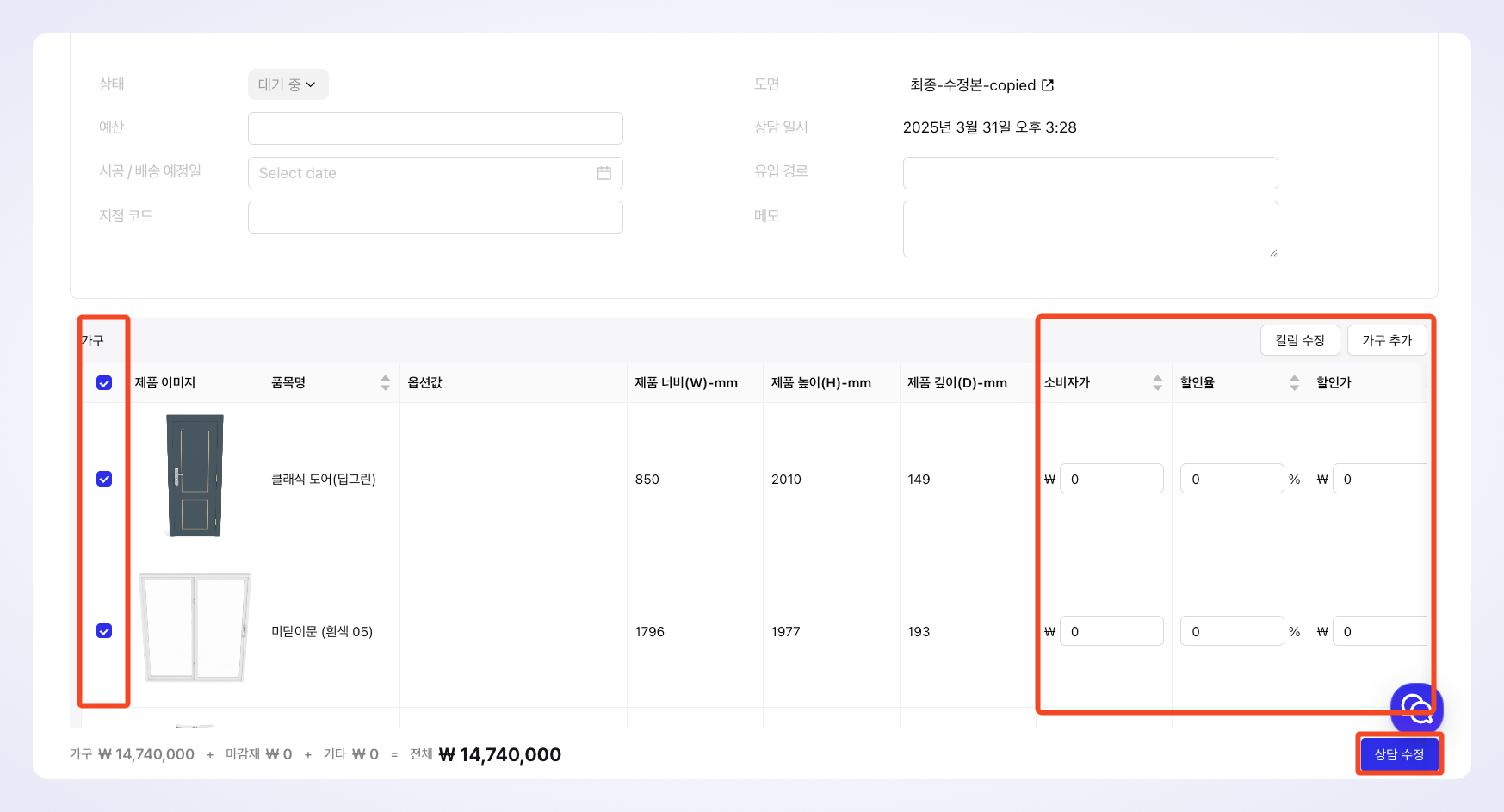 선택한 프로젝트에 배치된 제품들이 자동으로 불러와지며 체크박스, 금액, 수량 수정 영역이 활성화 되어 수정이 가능합니다.