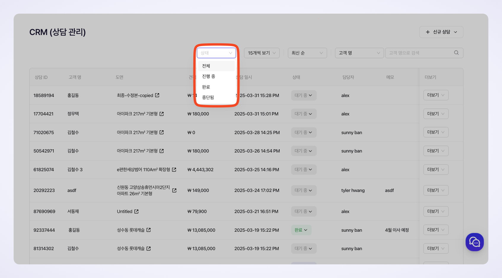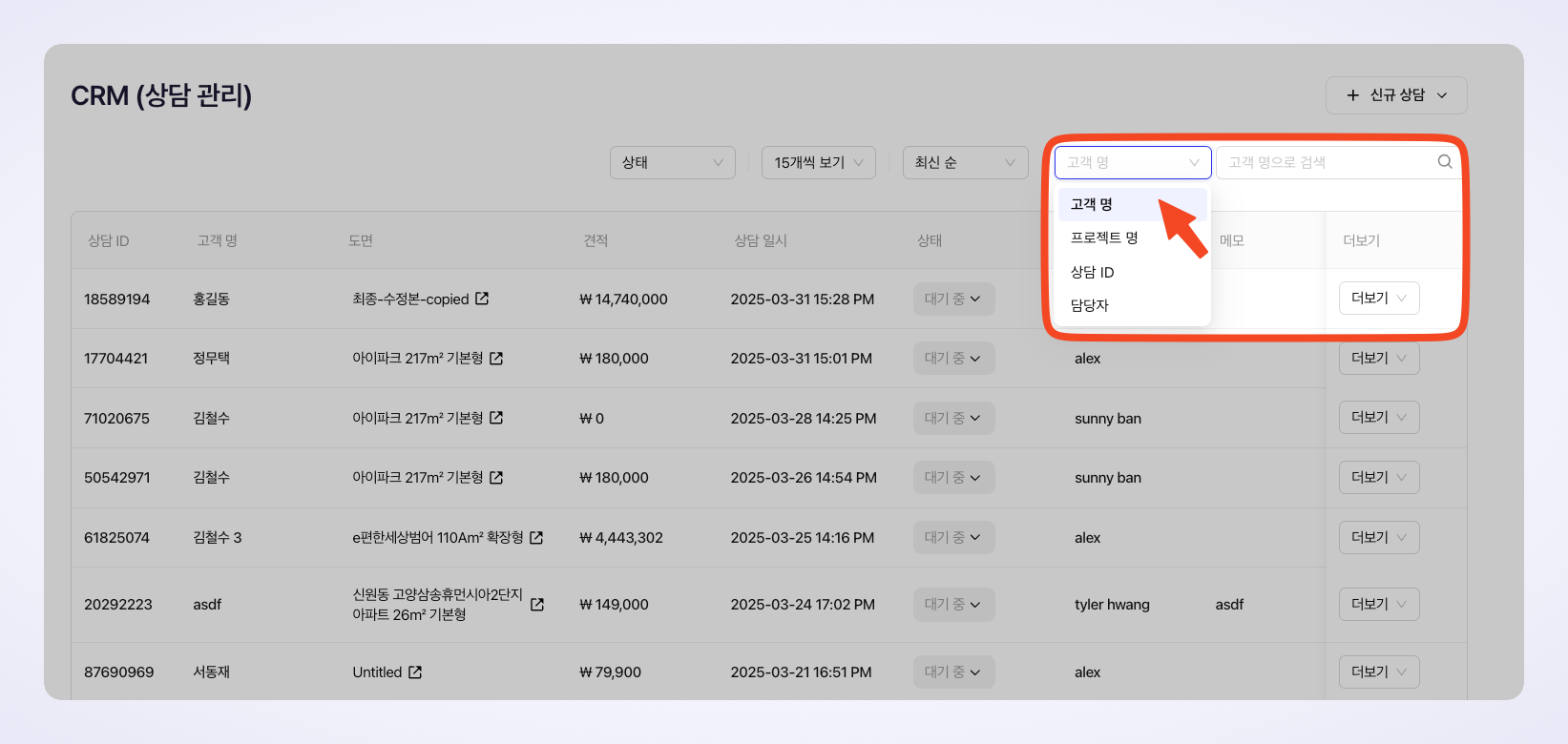 고객명, 프로젝트명, 담당자명, 상담 ID를 기준으로 검색 기능을 활용하여 원하는 고객 정보를 빠르게 찾을 수 있습니다. 검색창에 원하는 키워드를 입력하면 관련된 모든 리스트가 바로 나타납니다.