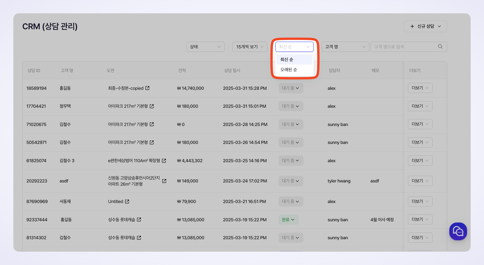 고객 리스트는 상담 생성순으로 정렬을 변경할 수 있습니다.