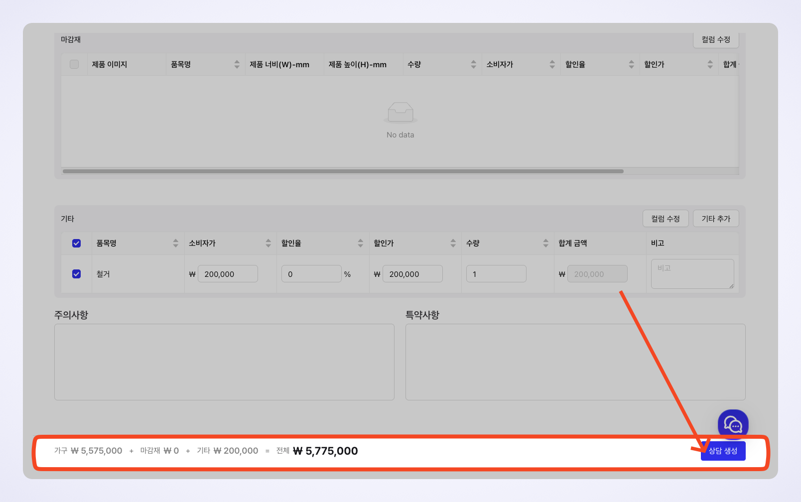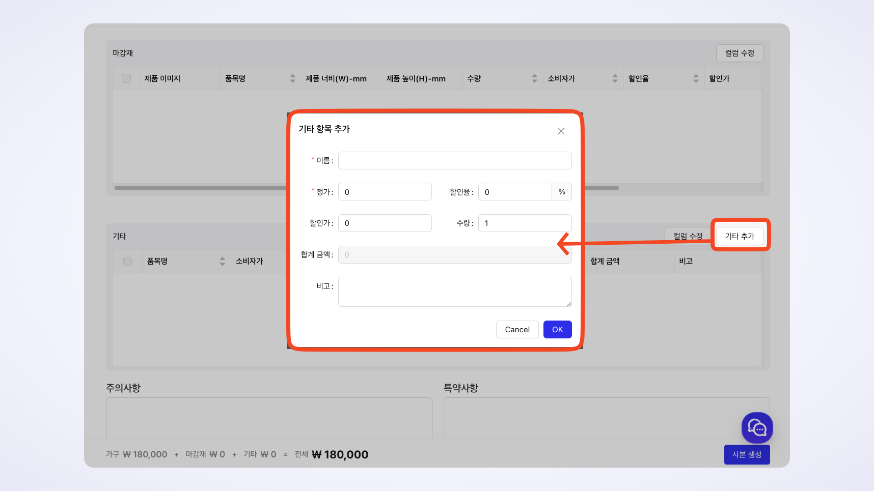 기타 항목을 입력하지 않으면 견적서에서 제외됩니다.