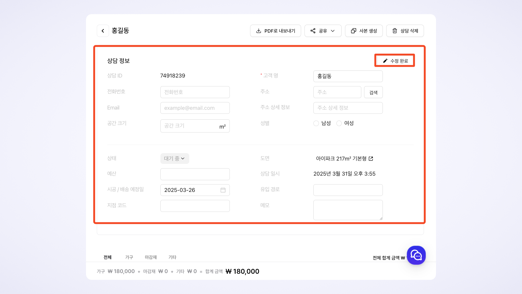 상담 정보 수정은 '고객' 관련된 정보만 수정 가능합니다. 또한, 담당자가 '나'여야 수정이 가능합니다. 타인이 생성한 견적은 수정할 수 없습니다.