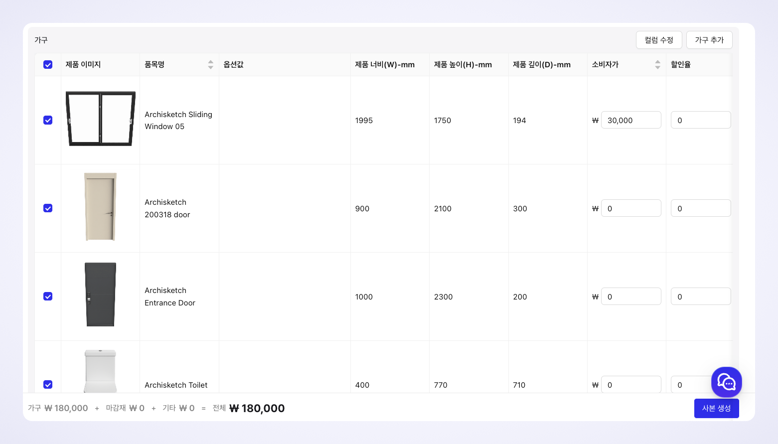 견적서에 포함시킬 가구를 선택합니다.