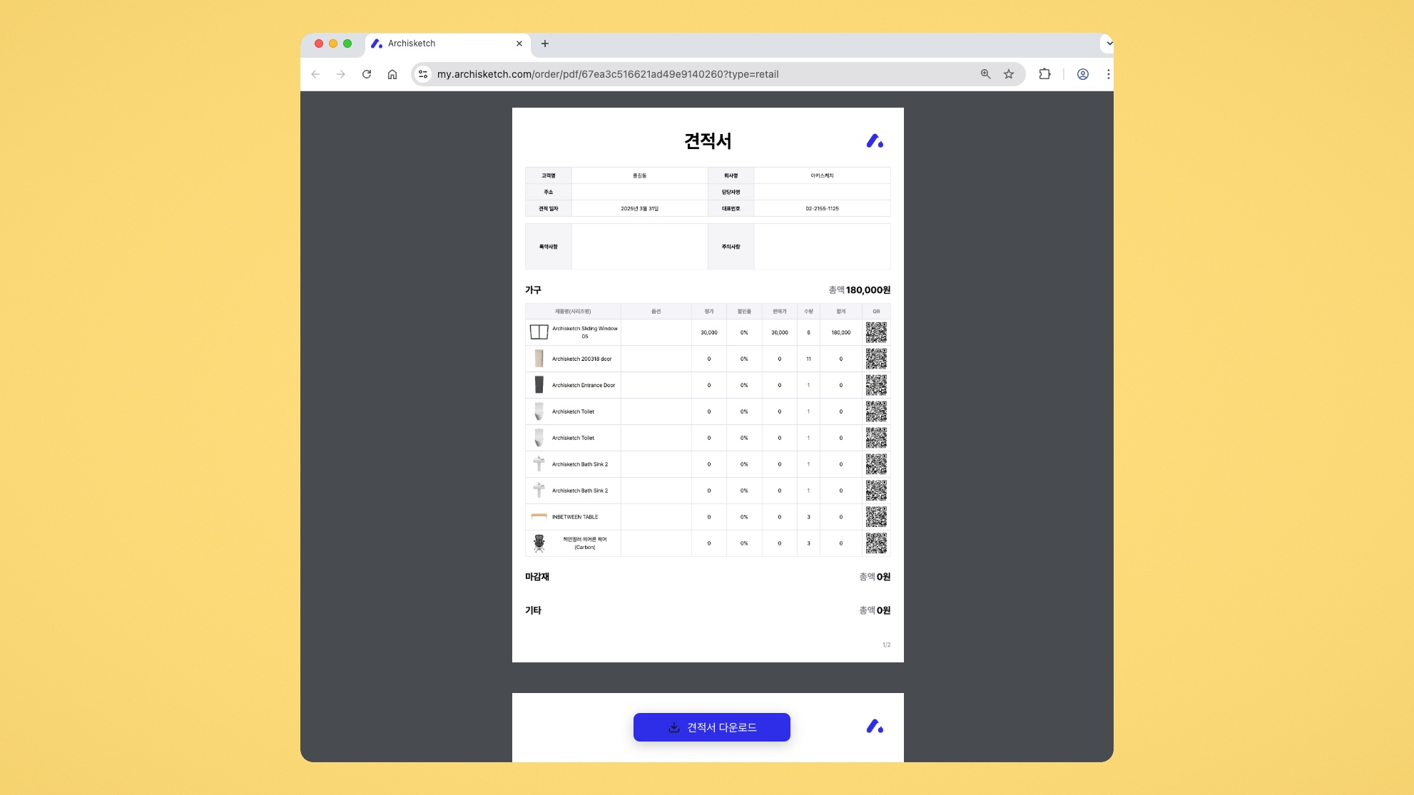 하단의 [견적서 다운로드] 버튼을 클릭하면 PDF 형식의 파일로 다운로드가 가능합니다.