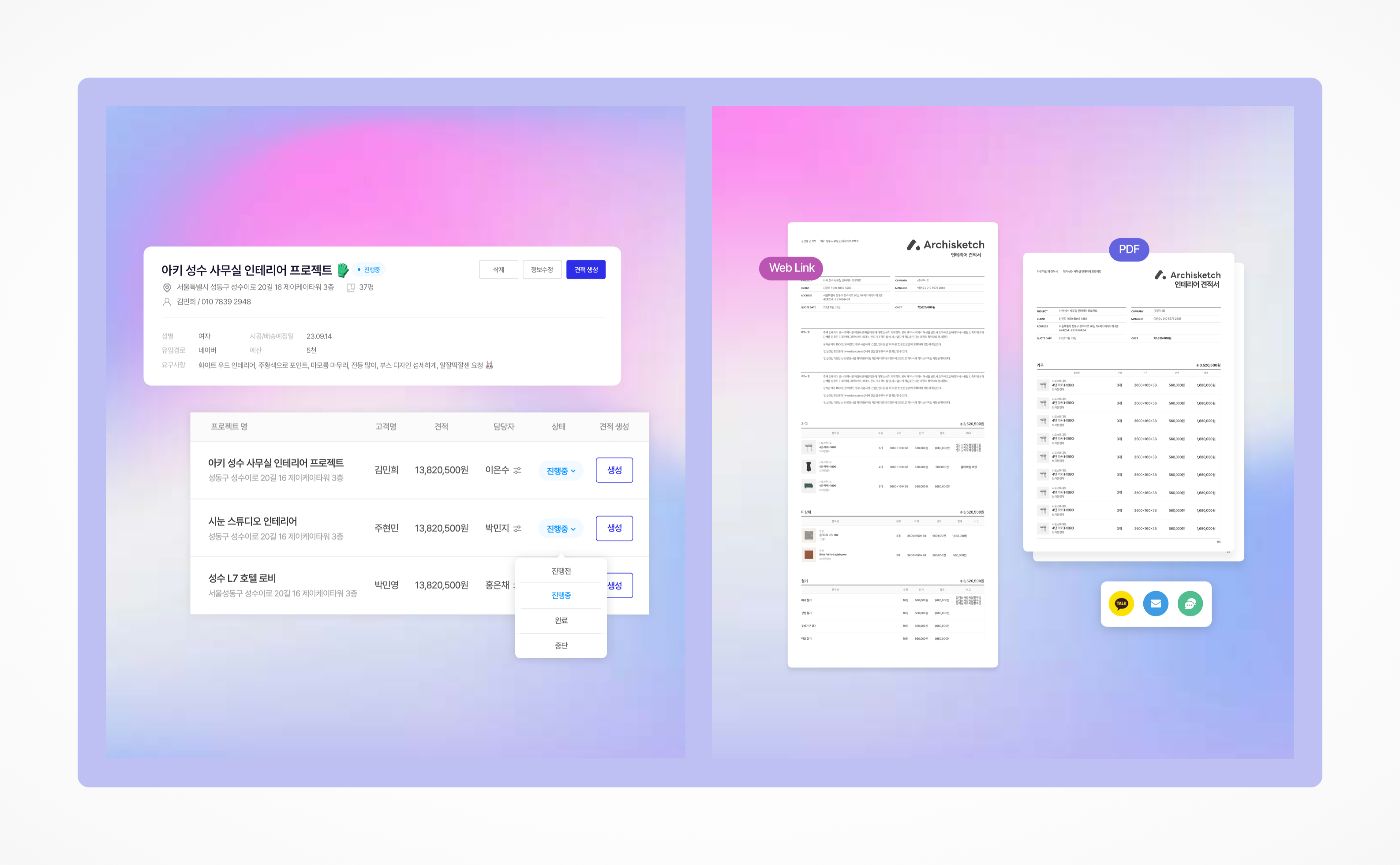 고객과의 상담 내용부터 견적서 생성, 전달까지 모든 과정을 한곳에서 처리해 시간을 절약할 수 있습니다.
