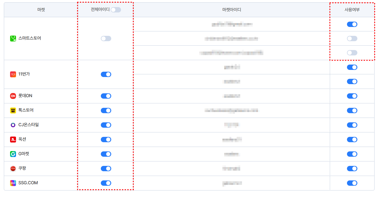 해당 탭에서 세트 내 적용할 마켓 및 마켓아이디 사용여부 수정도 가능해요.