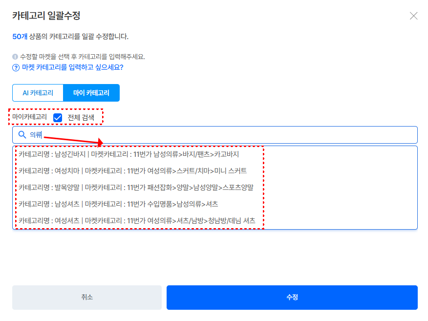 마켓별 카테고리를 직접변경하고 싶다면, 해당 마켓카테고리를 선택 후 수정 할 수 있어요.