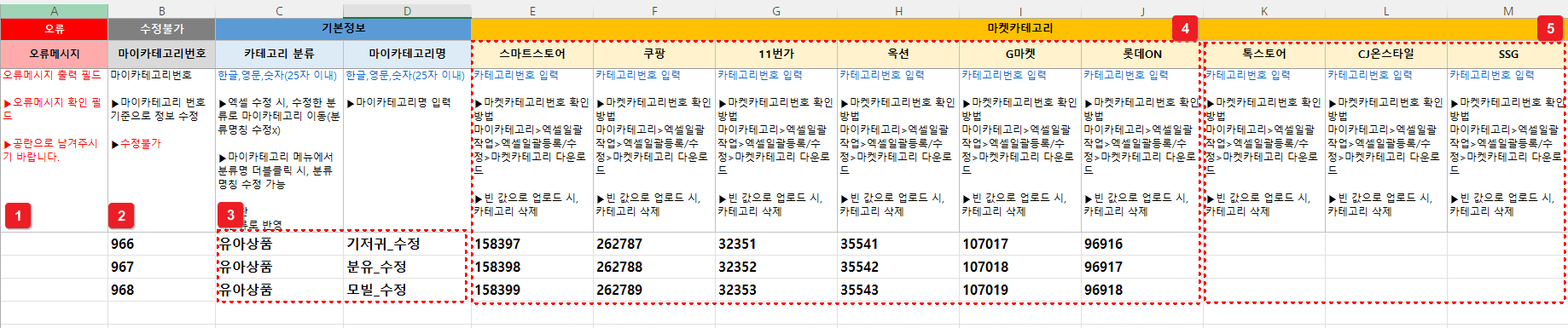 ③ 마켓카테고리(사용하는 마켓) : 각 마켓별 카테고리 번호를 입력해야 해요. 마켓별 카테고리번호는 아래 경로에서 다운로드한 뒤 확인할 수 있어요.