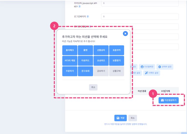 아래와 같이 이벤트 설정 화면에서 미션 만들기를 클릭하시고, 생성하고자 하는 미션을 클릭해 주세요.