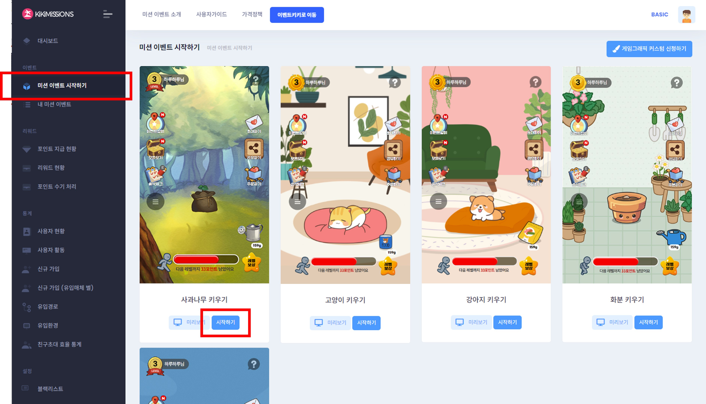 키키미션즈 시작은 왼쪽의 미션이벤트 시작하기 버튼을 누르고 템플릿을 선택하면서부터 시작할 수 있습니다.
