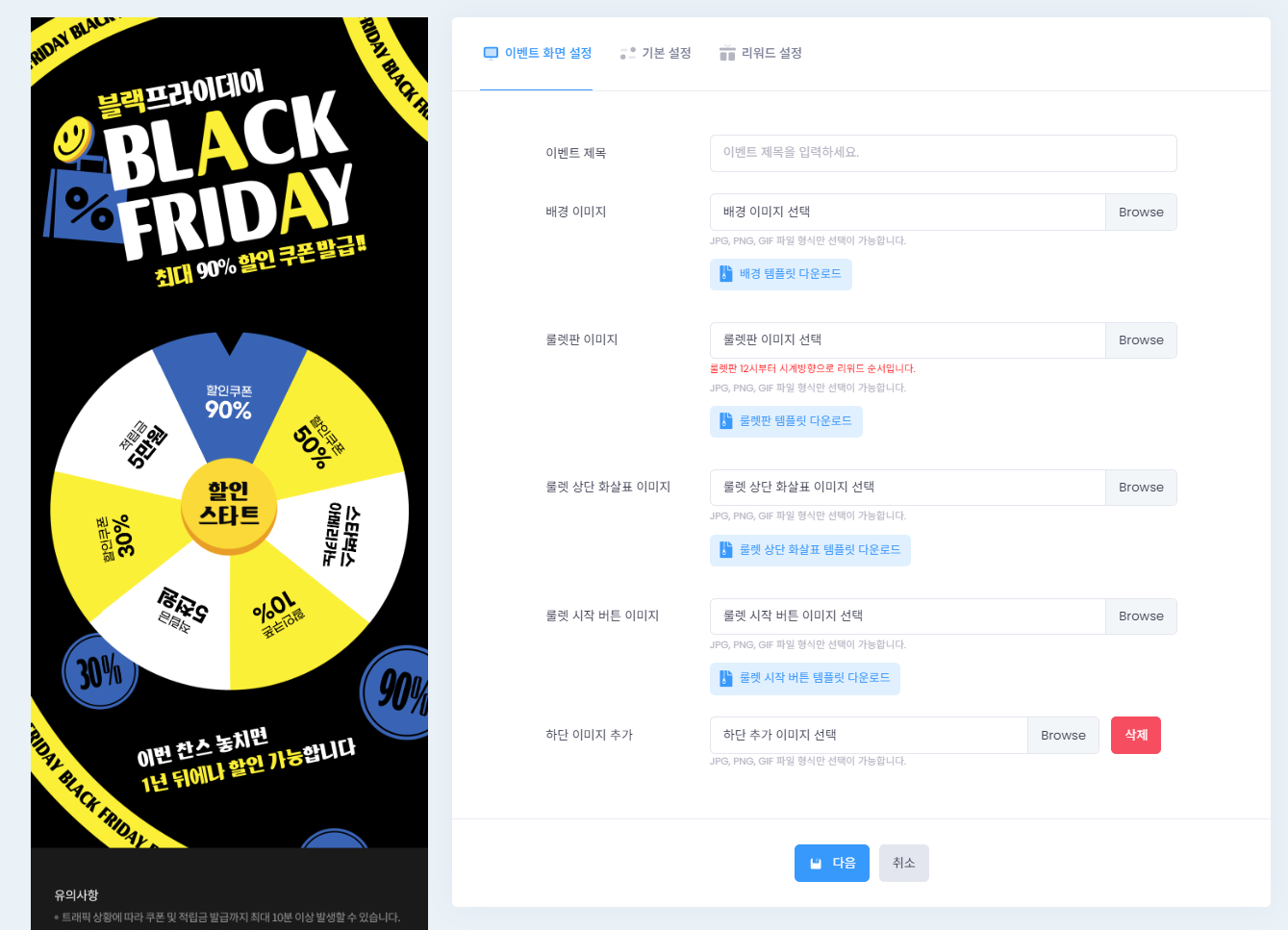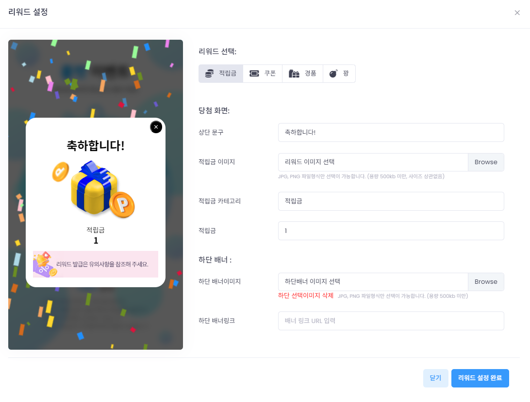 당첨화면을 보면서 리워드 내용을 입력해 주세요. 당첨 이미지는 가로 640 픽셀정도로 입력해 주세요. 세로는 반응형으로 수정됩니다.
