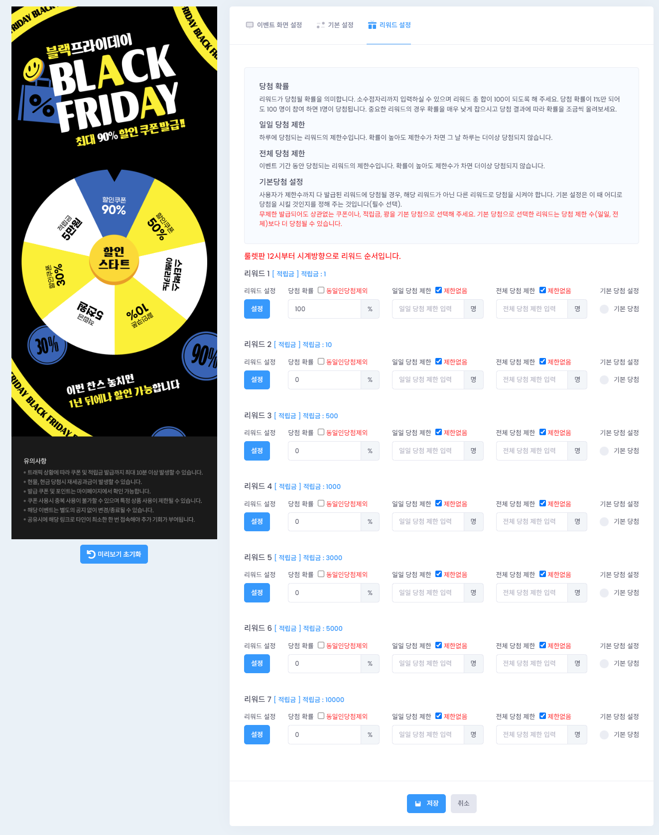 당첨 제한 | 일일, 전체 기간동안 당첨되는 제한수를 설정할 수 있어요. 당첨 제한수가 다 차면 더이상 해당 리워드는 당첨이 되지 않습니다. |