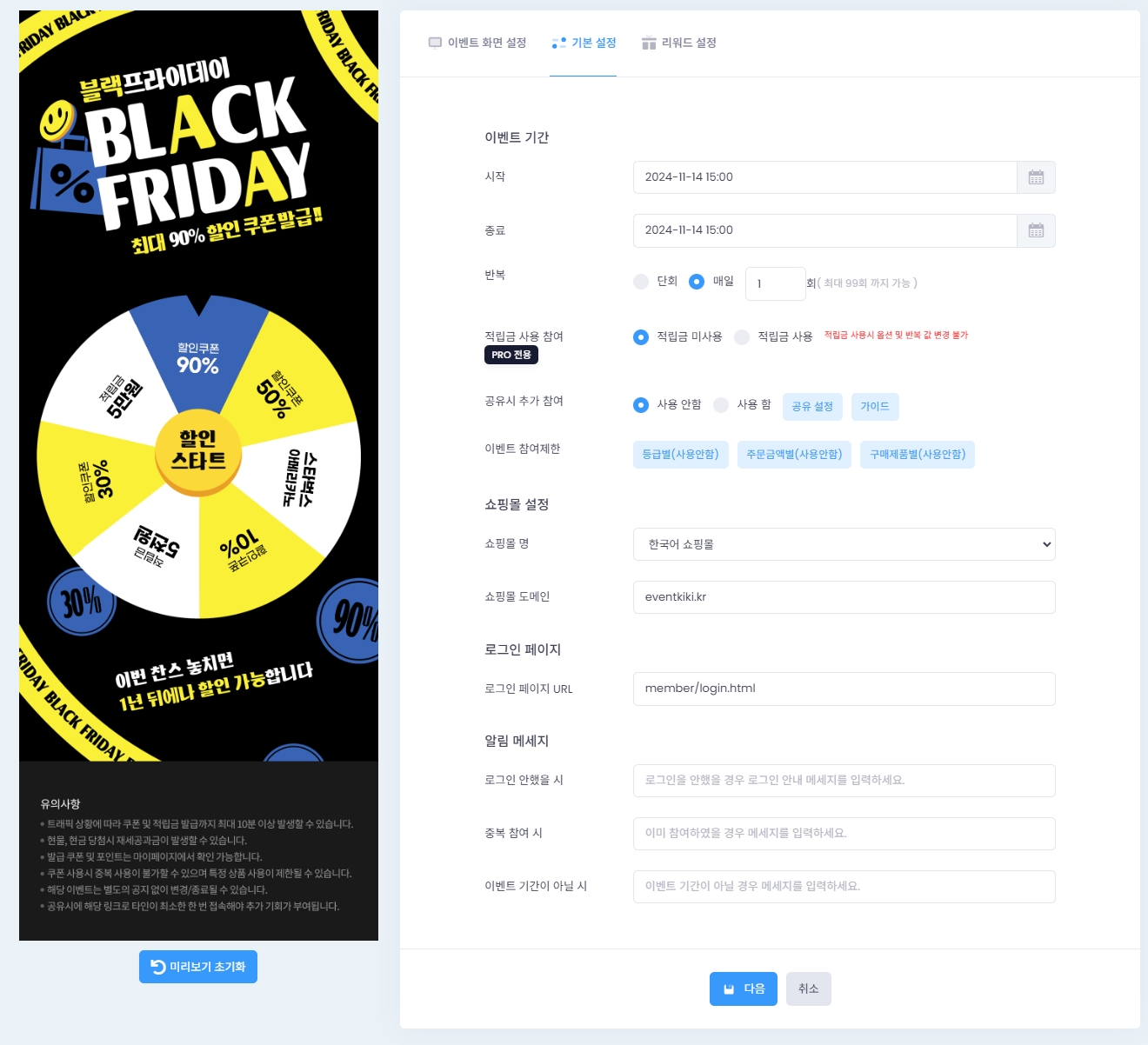 주문 금액별 참여 설정 | 특정 기간을 설정하고 해당 기간동안 특정 금액 이상 주문한 고객만 참여 가능 |