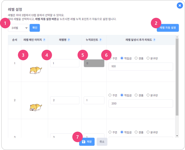 레벨 달성을 위한 누적 포인트를 입력할 수 있어요. 1레벨은 누적포인트가 0이기 때문에 입력하실 필요가 없습니다.