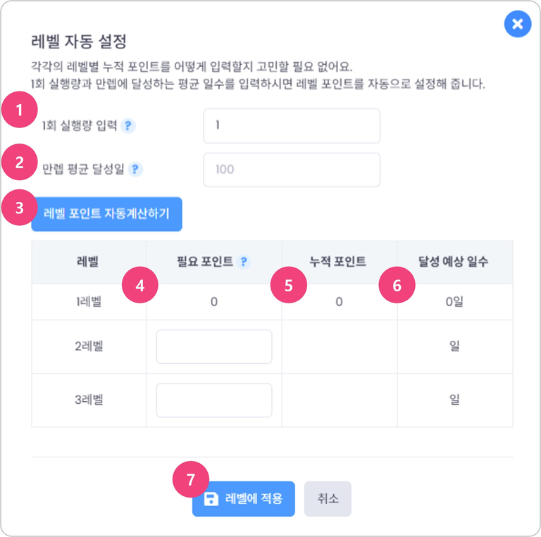 1회 실행량과 달성일을 입력후 레벨 포인트 자동 계산을 누르면 이에 맞는 필요포인트 및 누적포인트를 자동으로 계산해서 입력해 줍니다.