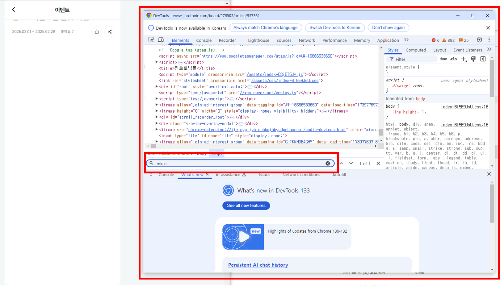 해당 창에서 Ctrl + F 키를 누르시고 mkiki 로 검색을 할 때 해당 js 파일이 삽입되어 있는지 확인할 수 있습니다.