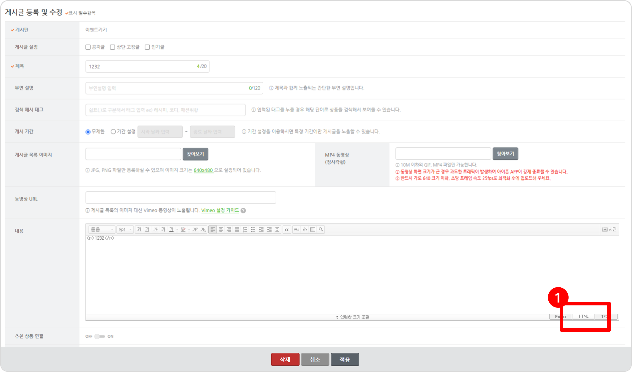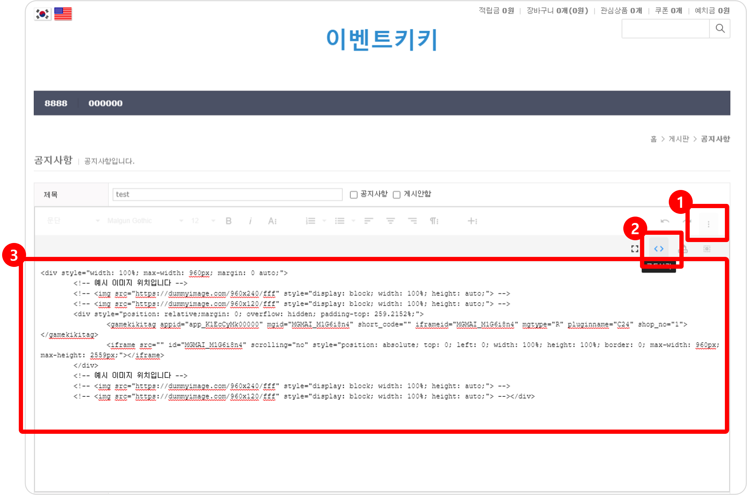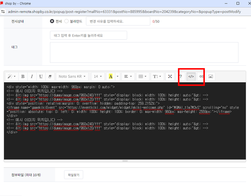 게시판 작성시 코드 보기 상태에서 복사한 코드 삽입