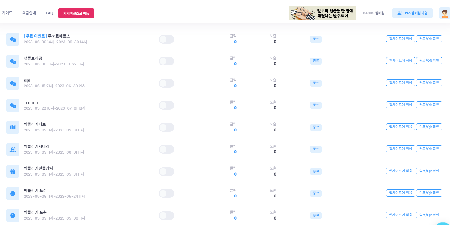 카페24, 플렉스지처럼 내 이벤트 리스트 → [웹사이트에 적용] 버튼 클릭 후 소스 복사하여 원하는 위치에 소스 붙여 넣기를 해 주세요.