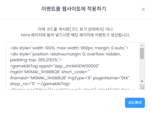 독립 서비스 운영시 이벤트키키와 연동 | 이벤트키키 API를 통해 로그인, 적립금 발급 처리 등을 연동하여 사용이 가능합니다. 내 이벤트리스트 → 웹사이트에 적용 클릭후 코드 복사 |