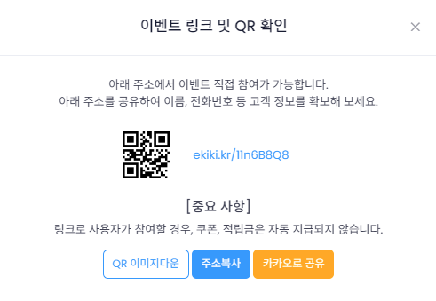 혹은 아래 팝업에서 링크를 공유하셔서 직접 랜딩페이지로 사용자를 유도하실 수 있습니다.