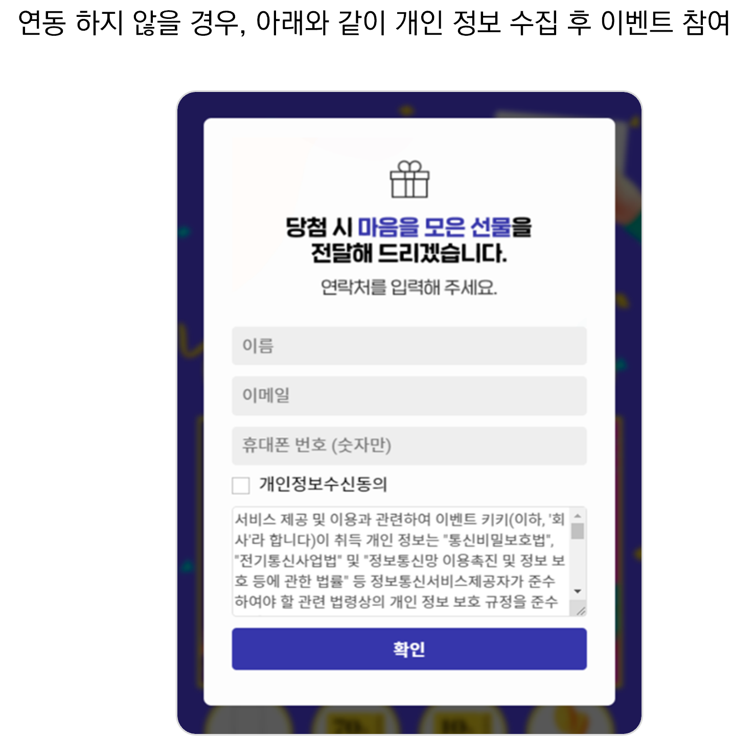 연동이 되어 있지 않은 경우 | 별도의 회원 정보를 받고 이벤트에 참여하도록 가능 QR 을 통한 랜딩페이지 별도 제공함. |