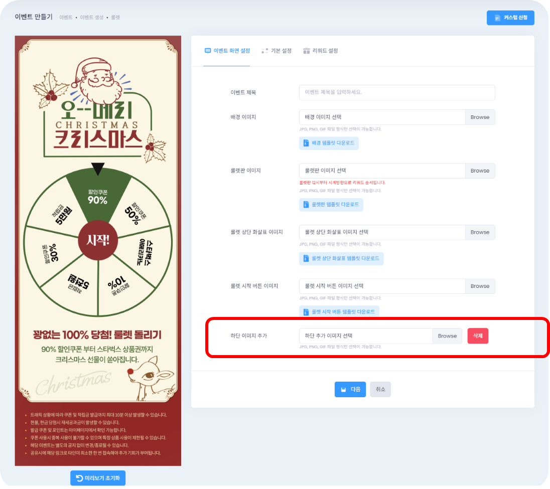 이벤트키키 설정 페이지에서 하단 이미지를 추가할 수 있습니다.