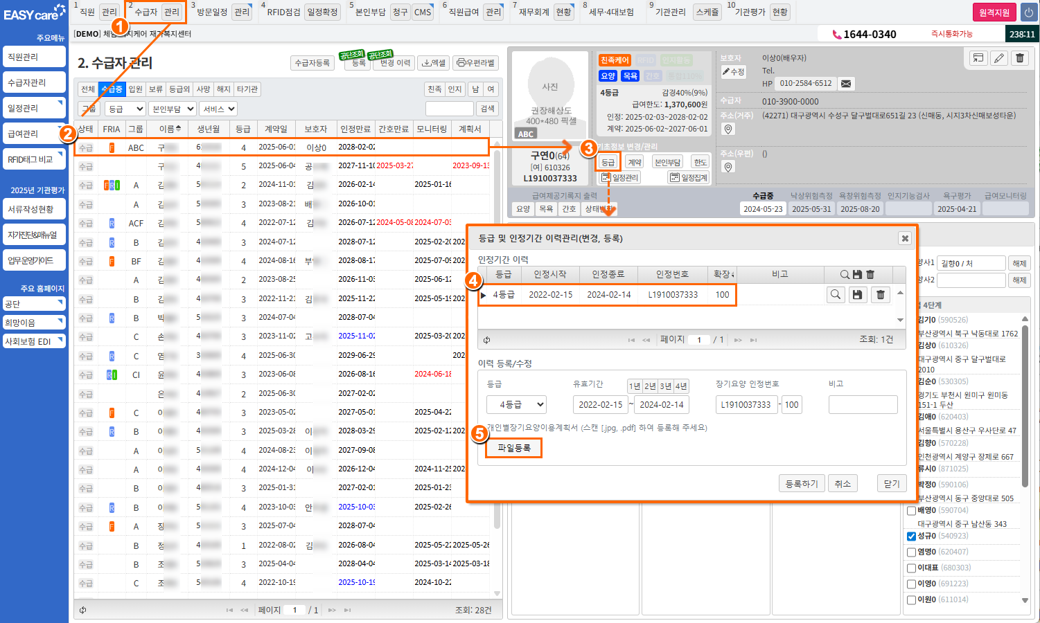 2수급자 관리]> 수급자 선택우측 사진 등록창 옆 "등급" 클릭