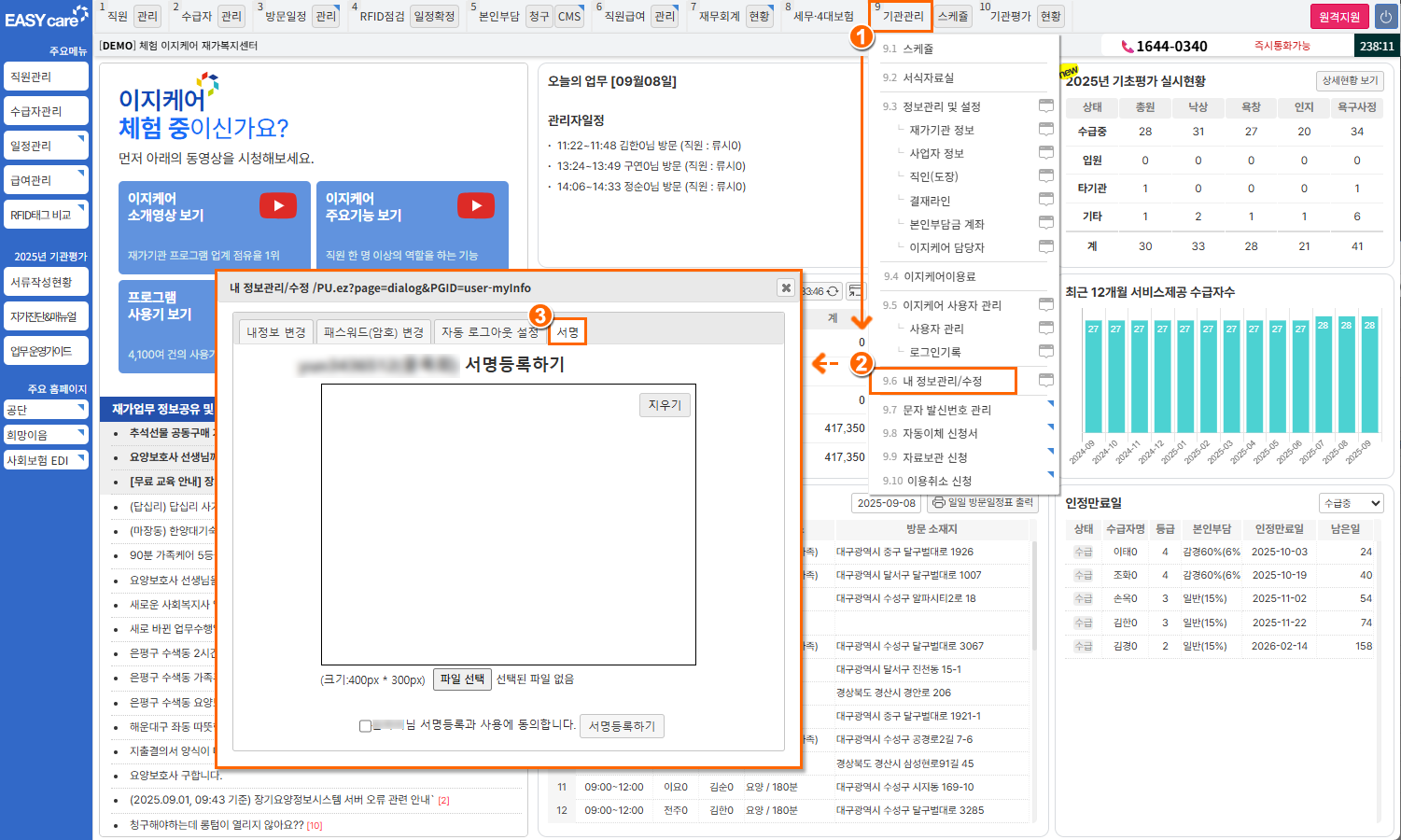 9기관관리] > [9.6 내 정보관리/수정] 클릭탭: 서명 클릭