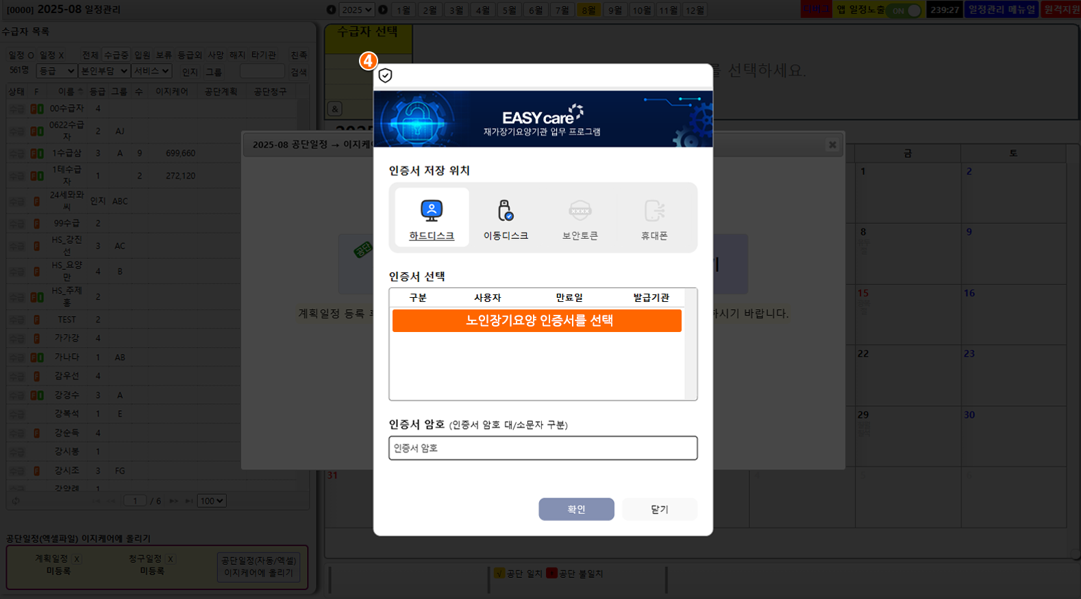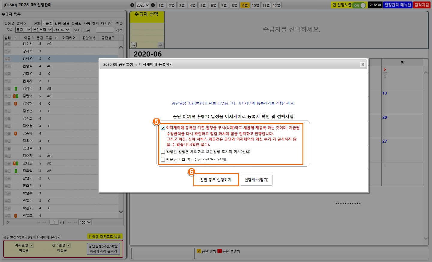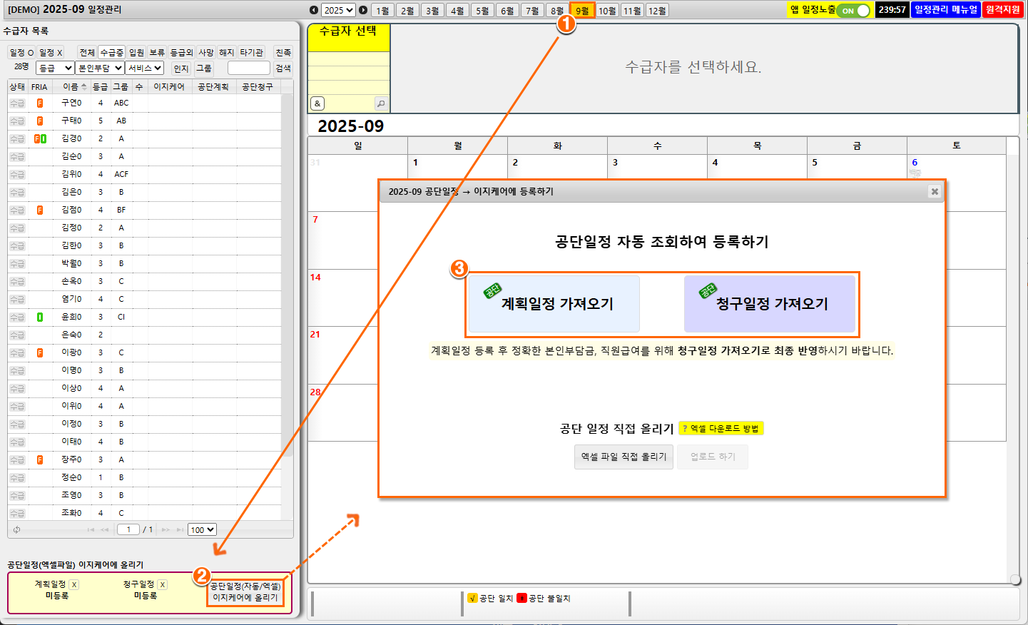 3방문일정 관리] > 해당 월 선택좌측 하단 "공단일정(자동/엑셀) 이지케어에 올리기" 클릭
