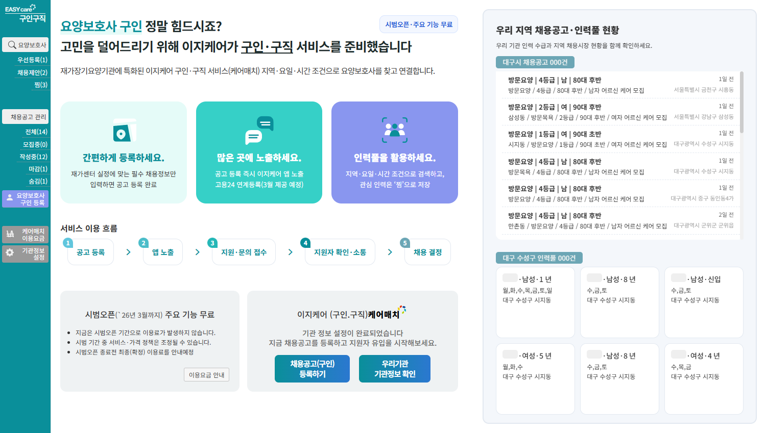 요양보호사 구인이 점점 어려워지는 환경 속에서, 재가장기요양기관의 실제 채용 과정을 고려한 이지케어 구인·구직 서비스를 오픈했습니다.