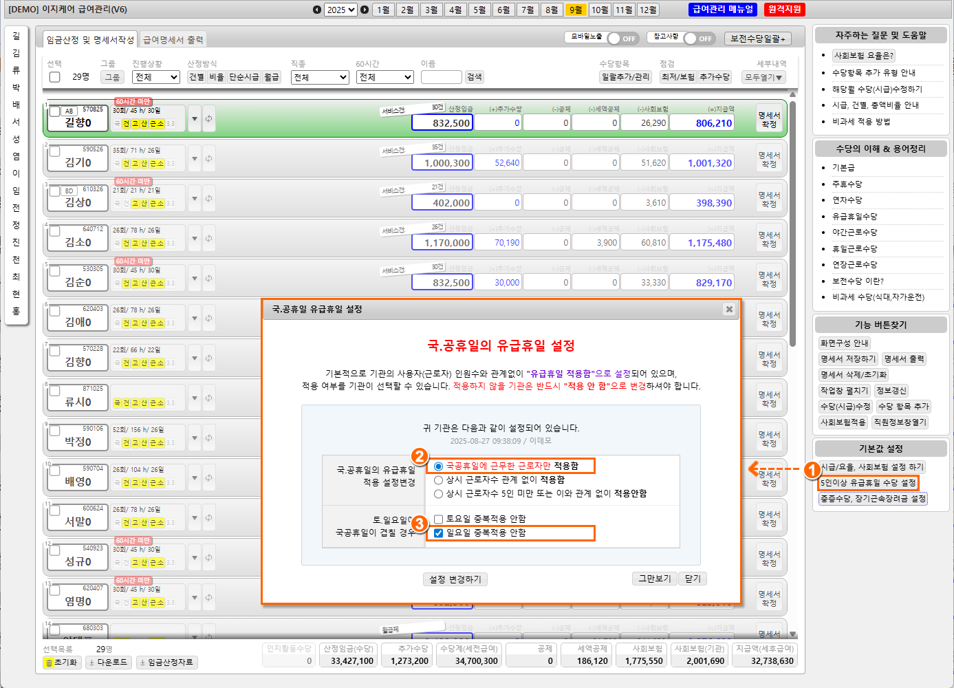 6직원급여 관리] 클릭우측 하단 기본값 설정 항목의 "5인 이상 유급휴일 수당 설정" 클릭
