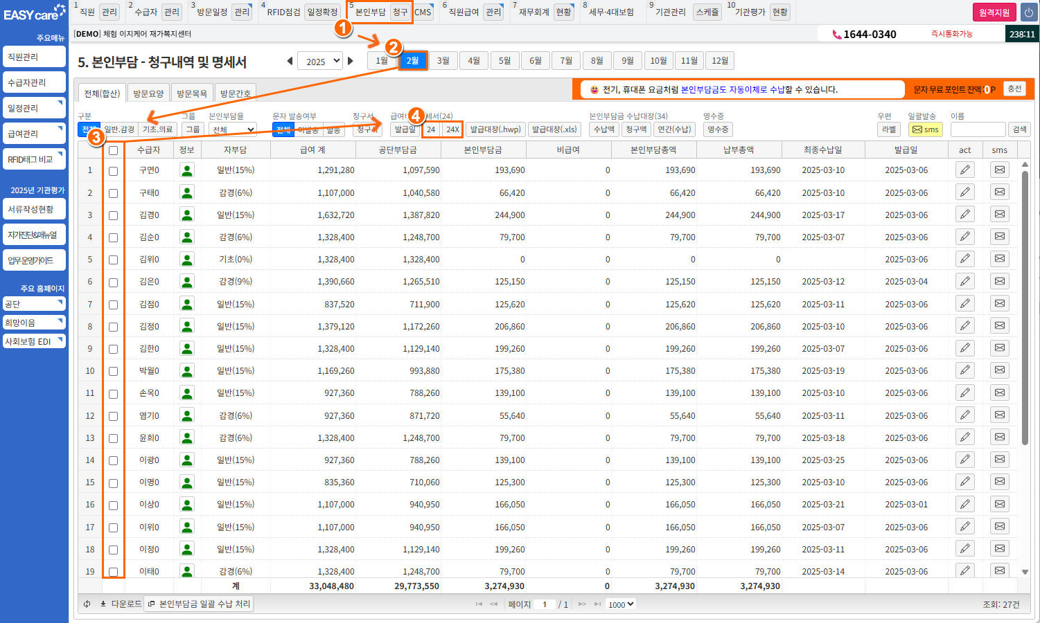 5본인부담 청구] > 해당 월 선택일괄 또는 출력 대상자 선택
