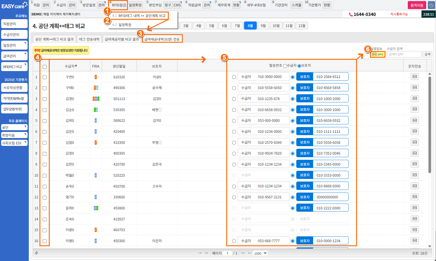 4RFID점검] > [4.1RFID태그내역 ↔ 공단계획 비교] 클릭탭: 급여제공내역(요양) 전송 선택