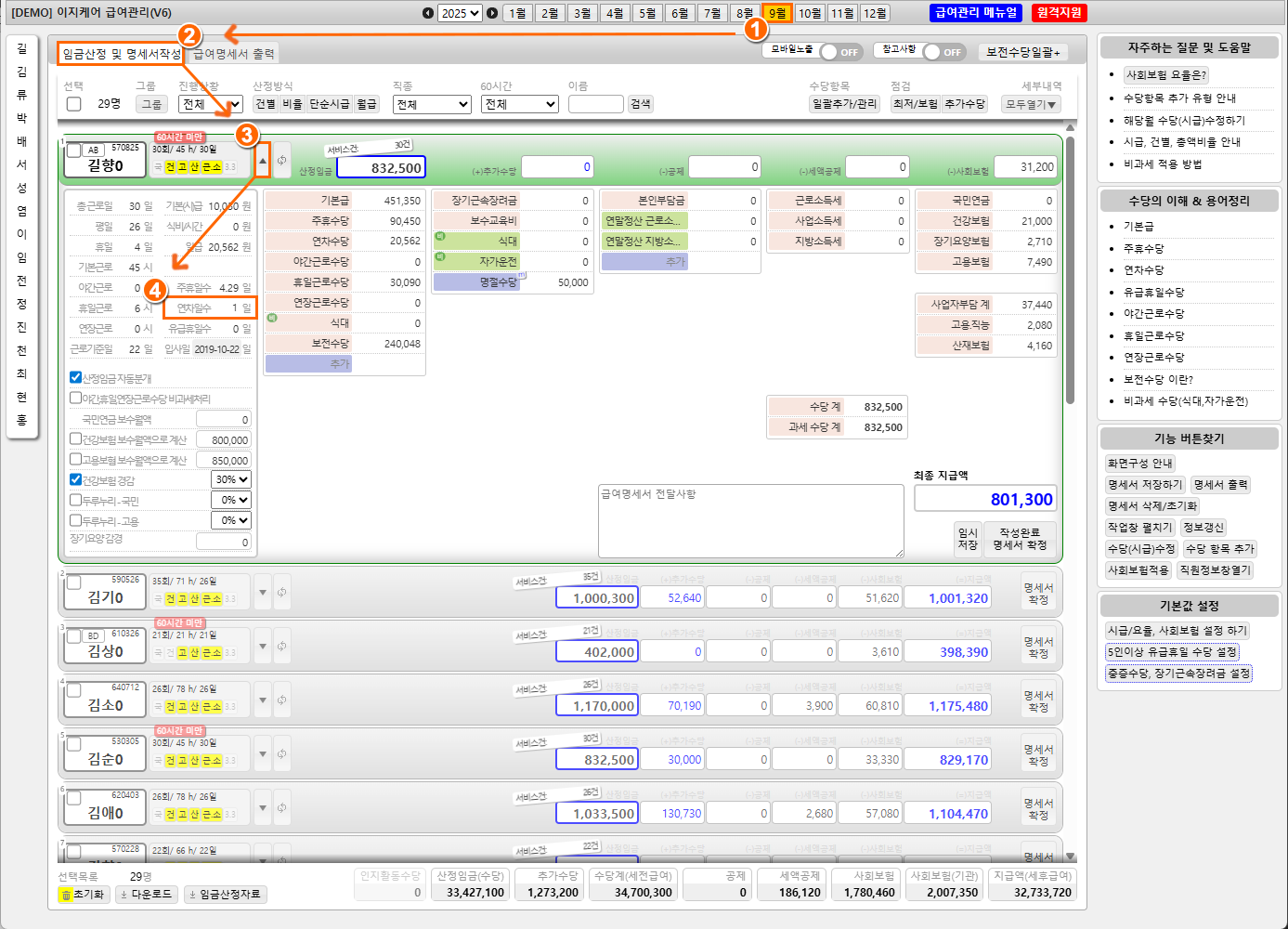 이지케어에서는 급여 화면에서 직원별로 연차수당을 직접 입력할 수 있어요.