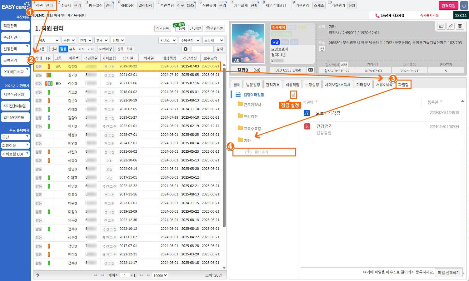 1직원관리] 또는 [2수급자관리]해당 수급자 선택