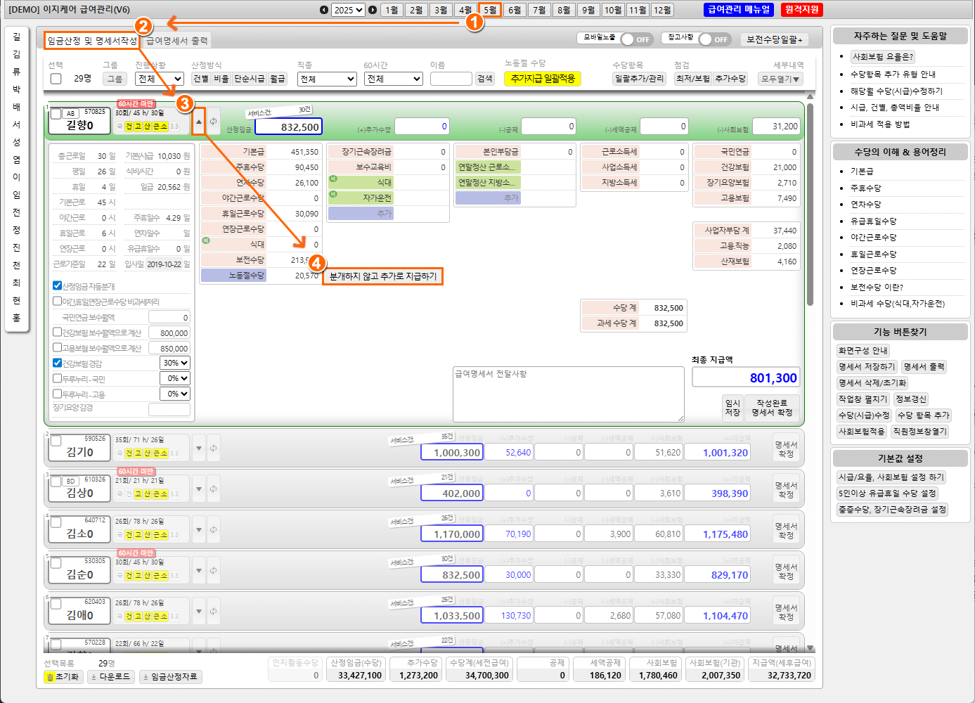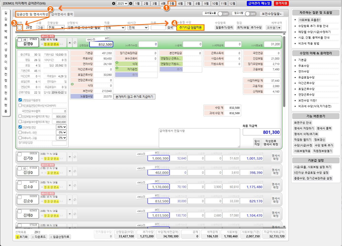 "추가 지급 일괄 적용"버튼 클릭전체 직원에게 노동절 수당(근로자의날)이 추가 지급으로 반영